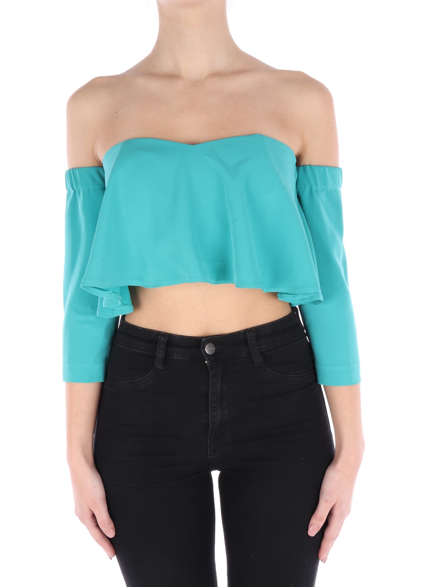 Top verde turchese corto, con le spalle scoperte. Caratterizzato dal bustino con scollo a cuore e stecche rigide coperte da una balza morbida nello stesso colore e tessuto. Chiusura posteriore con cerniera e maniche staccabili con elastico arricciato nella parte superiore di modo che si mantengano. Il taglio alla moda e il colore forte lo rendono il capo perfetto da indossare per un'occasione più importante se si vuole essere eleganti e glamour allo stesso tempo.