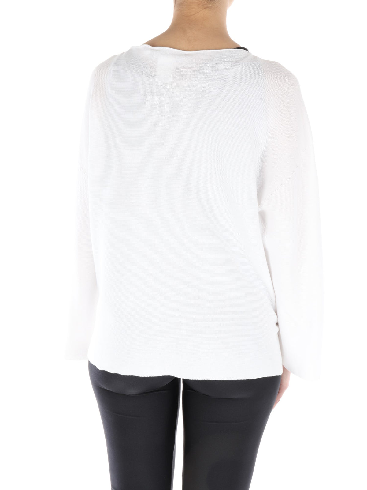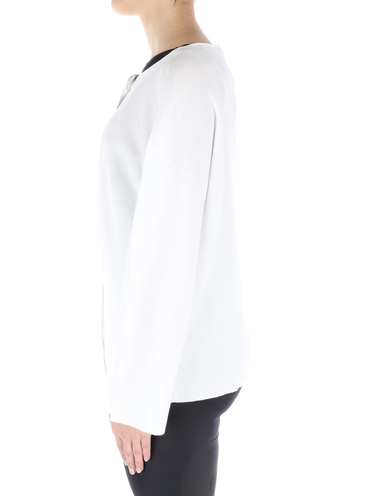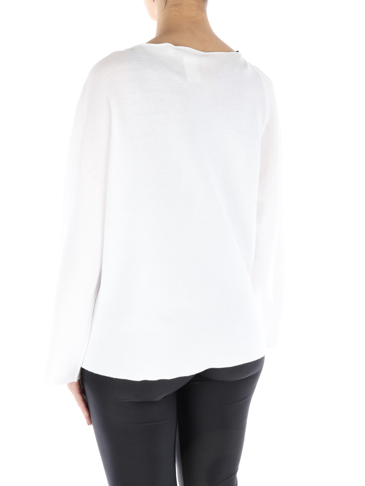 Cardigan bianco caratterizzato da scollo rotondo, chiusura con un solo grande bottone centrale a pressione all'altezza della gola e manica lunga e ampia. La vestibilità ampia e il taglio classico con apertura centrale che lascia intravedere il capo indossato sotto, sono perfetti per la donna che vuole essere sempre comoda, ma anche chic.
