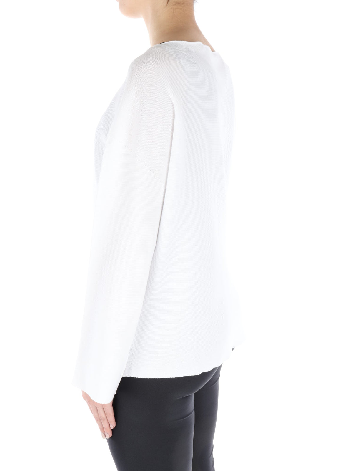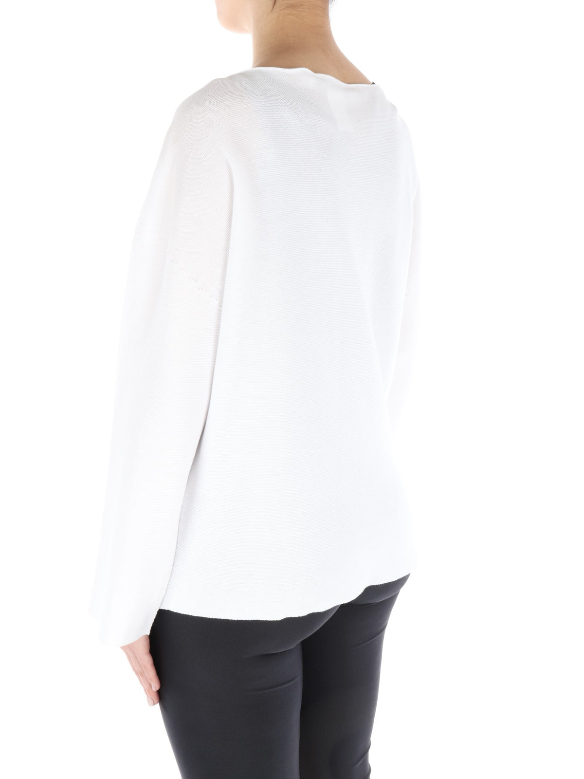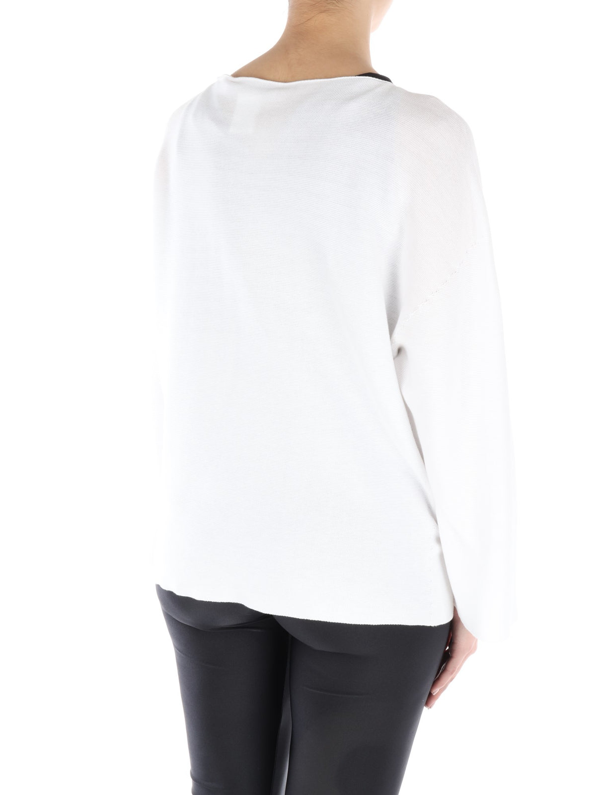 Cardigan bianco caratterizzato da scollo rotondo, chiusura con un solo grande bottone centrale a pressione all'altezza della gola e manica lunga e ampia. La vestibilità ampia e il taglio classico con apertura centrale che lascia intravedere il capo indossato sotto, sono perfetti per la donna che vuole essere sempre comoda, ma anche chic.