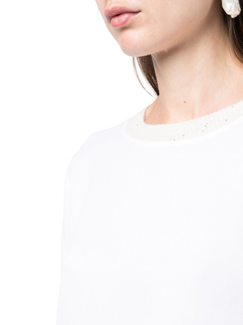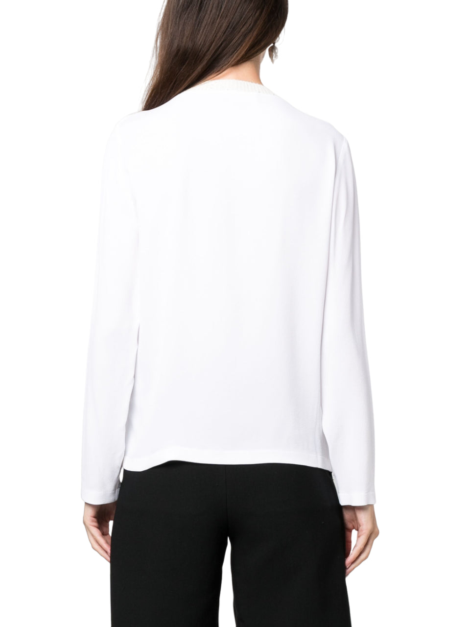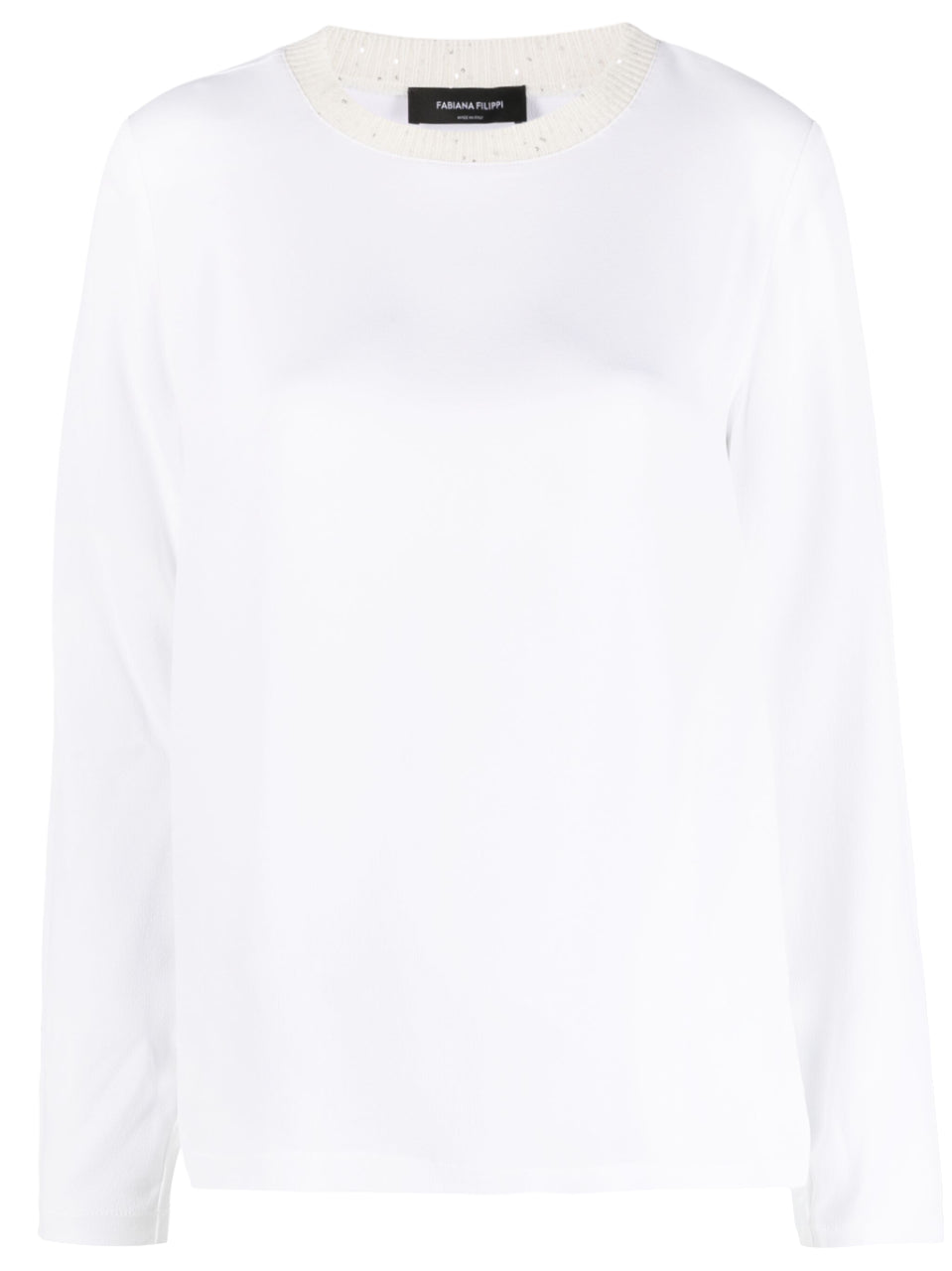 Bianco, girocollo, maniche lunghe e orlo dritto.