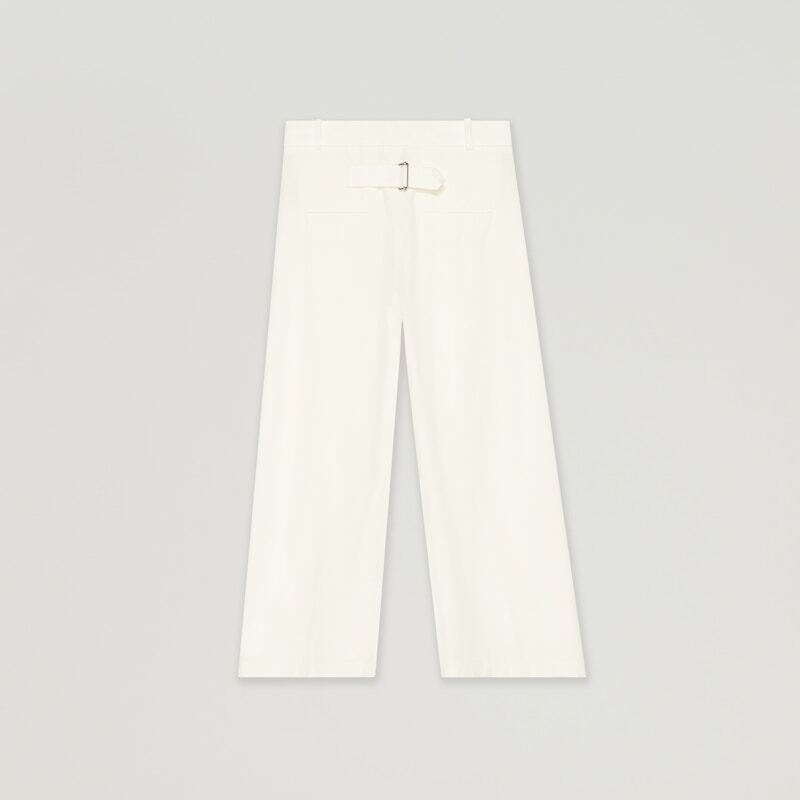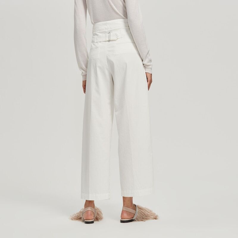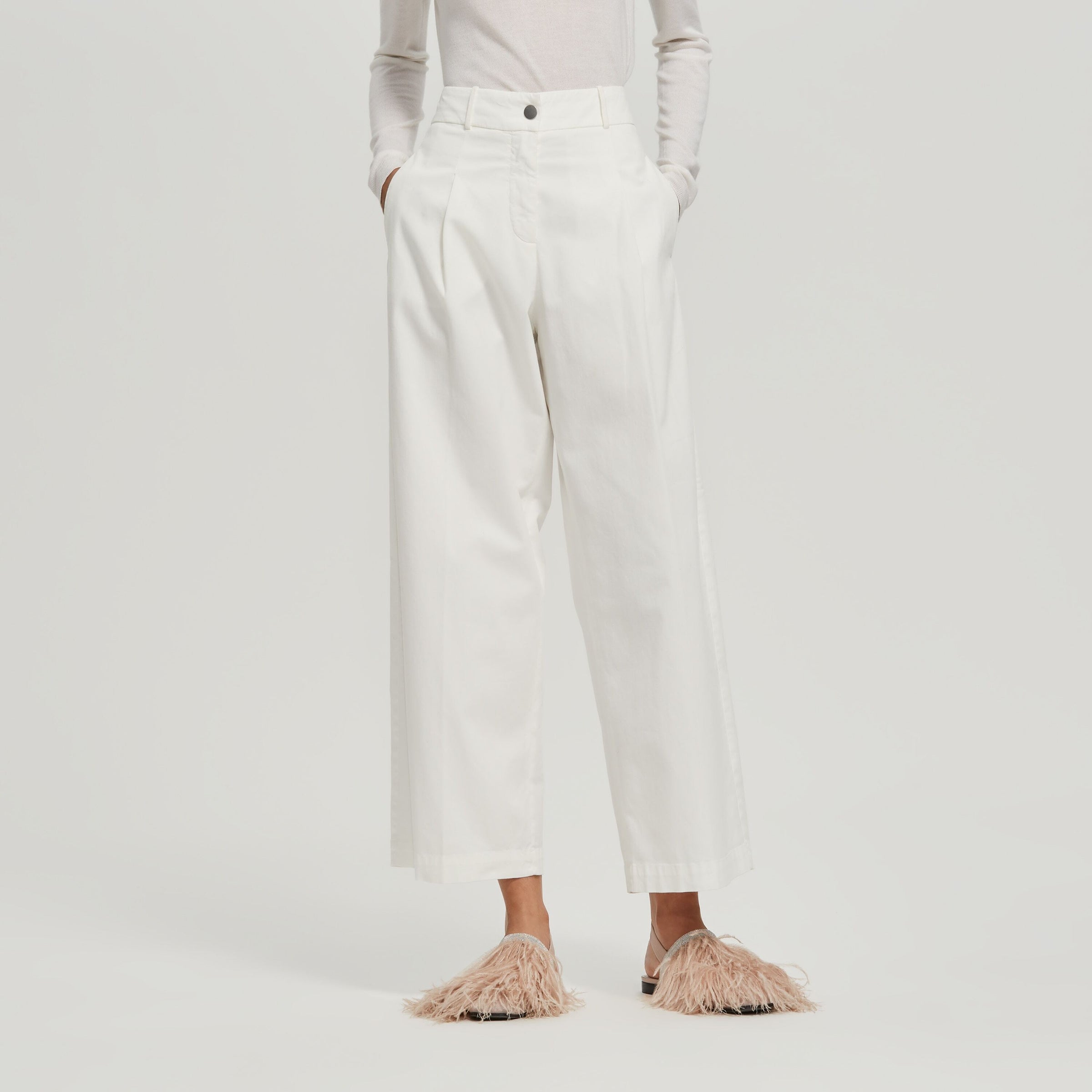 Una novità della collezione autunno inverno 22-23 firmata Fabiana Filippi. Realizzato in morbido cotone tinto capo, questo pantalone plissé a gamba larga combina comfort a un design contemporaneo. La linea loose fit definisce un modello da indossare nella quotidianità abbinando stile e raffinatezza. La modella è alta 1,77cm e indossa la taglia 40