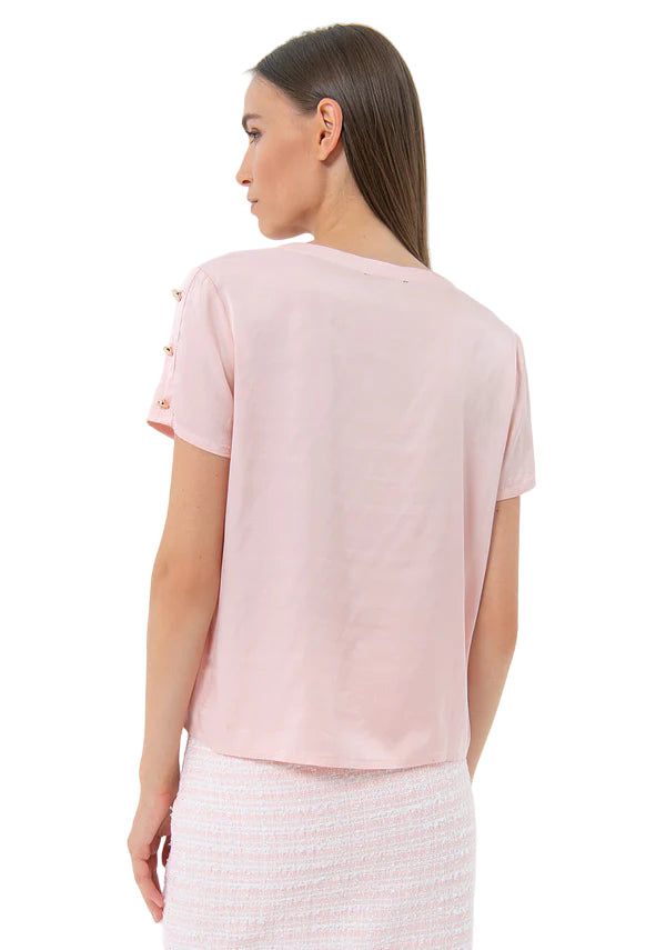 Blusa regular girocollo, maniche corte, e con bottoncini sulle spalle.