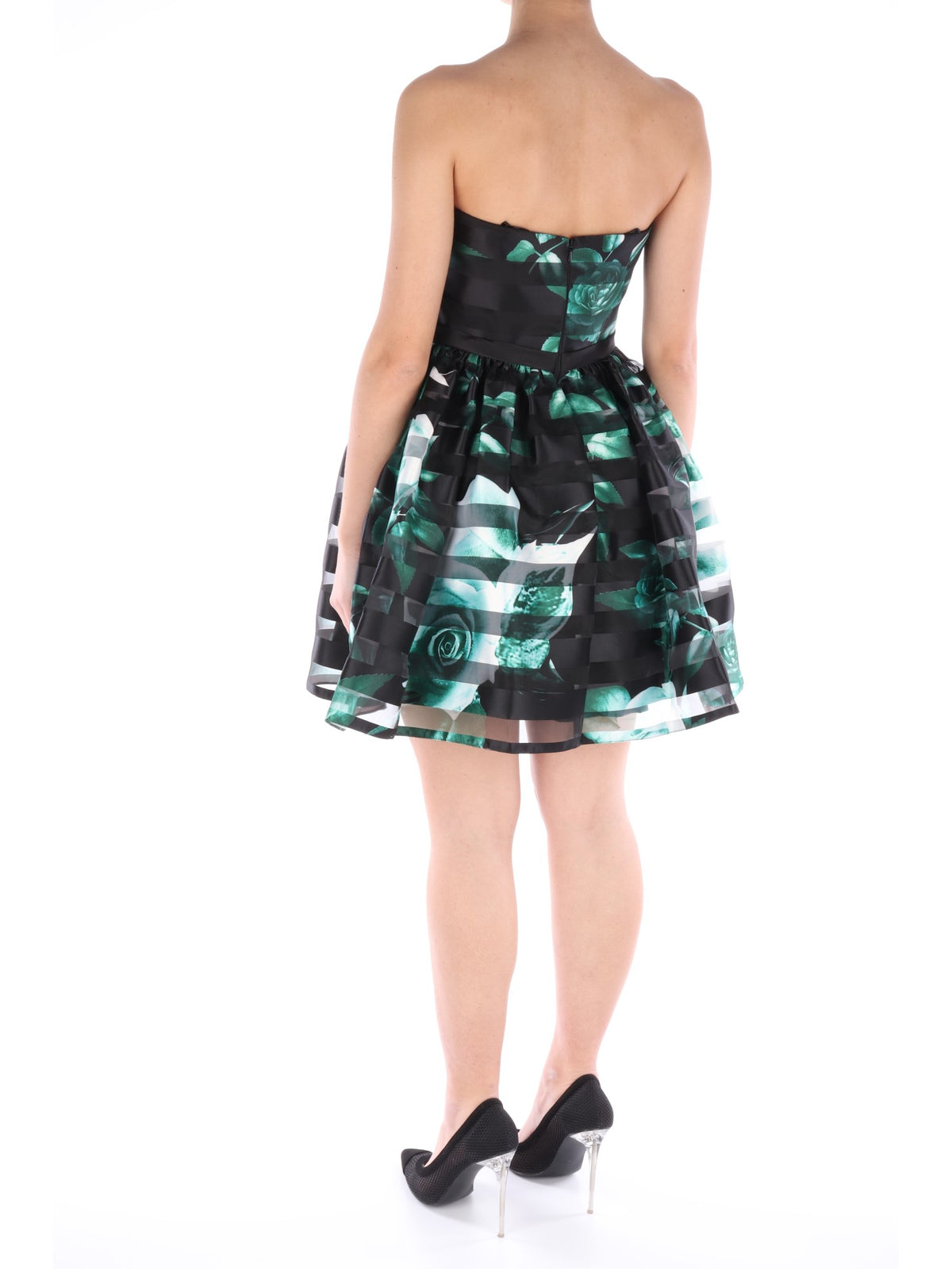 Abito corto nero e verde con fodera nera in poliestere e stola in tessuto nero velato. Si caratterizza per il corpetto con spalline nere staccabili, scollo dritto, cintura di tessuto in vita, chiusura posteriore con cerniera nascosta e gancetti finali e strato esterno in tessuto velato a strisce e gonna corta svasata. La semplicità e la raffinatezza di questo abito sono perfette per qualsiasi occasione, che sia un cocktail party con invitati importanti, oppure una cerimonia elegante.