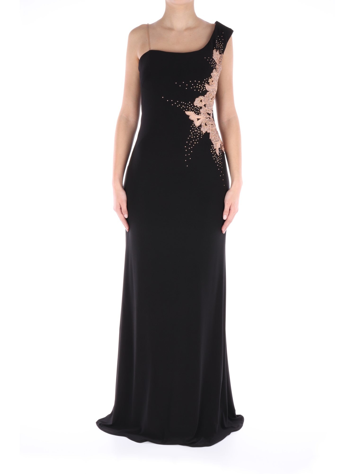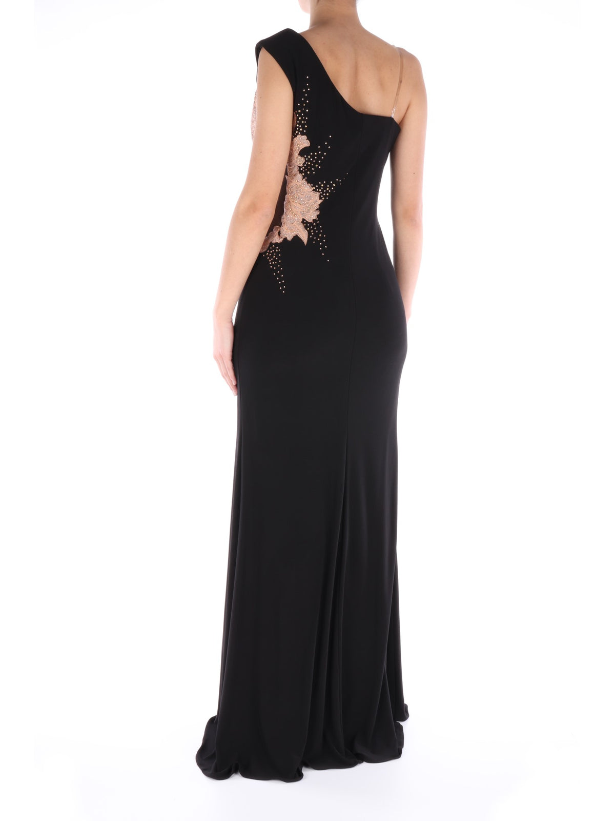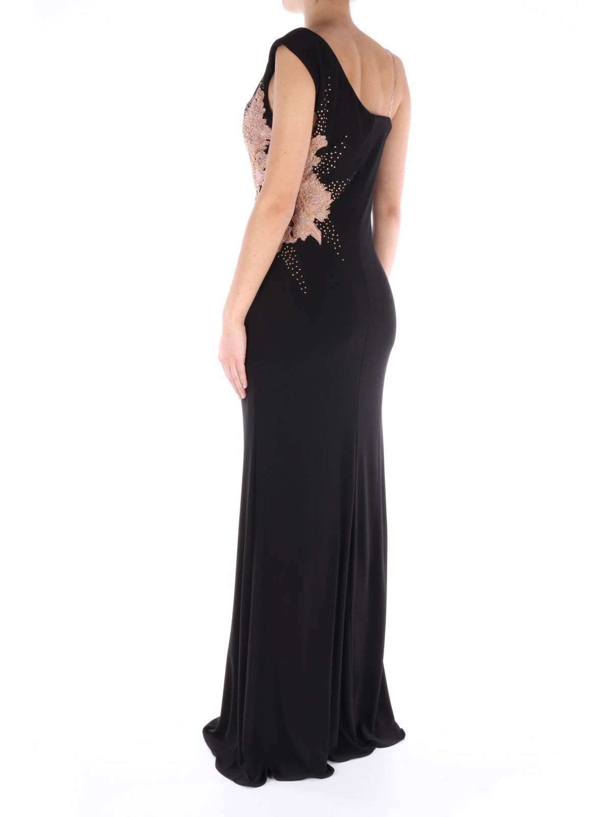 Abito nero lungo, con fodera nera in poliestere e stola nera in tessuto velato. Si caratterizza per lo scollo dritto con una spallina larga e una sottile invisibile, ricamo floreale color rosa antico, strass e tessuto velato sul fianco sinistro, sia sulla parte anteriore che posteriore, chiusura con cerniera nascosta sul lato destro e taglio classico leggermente scampanato nella parte inferiore. Risulta essere il capo perfetto per avere un look molto elegante, intramontabile e mai banale.