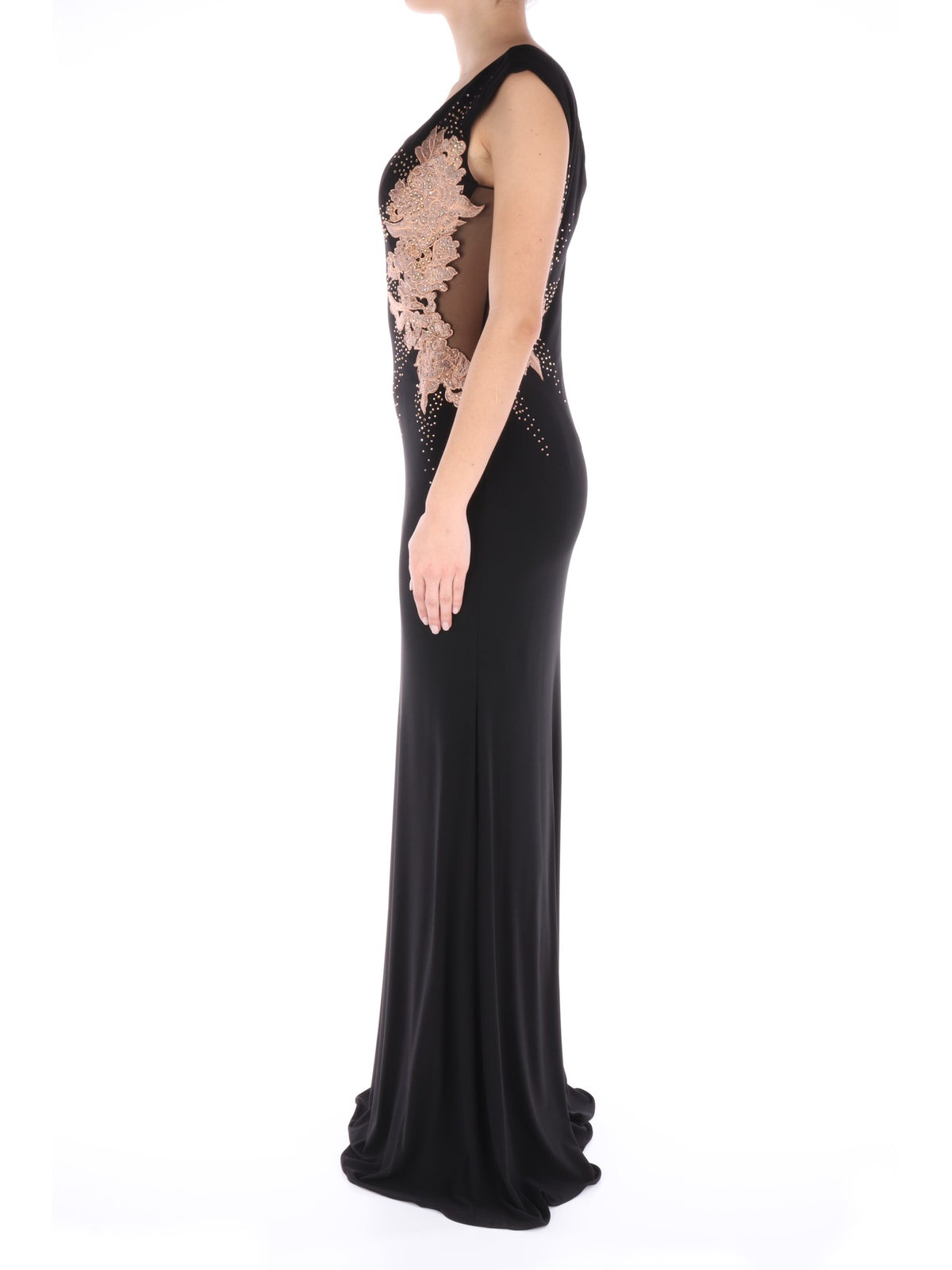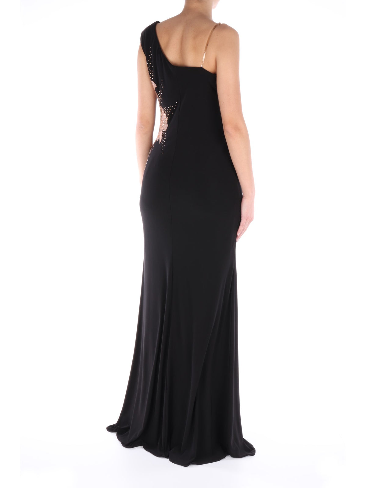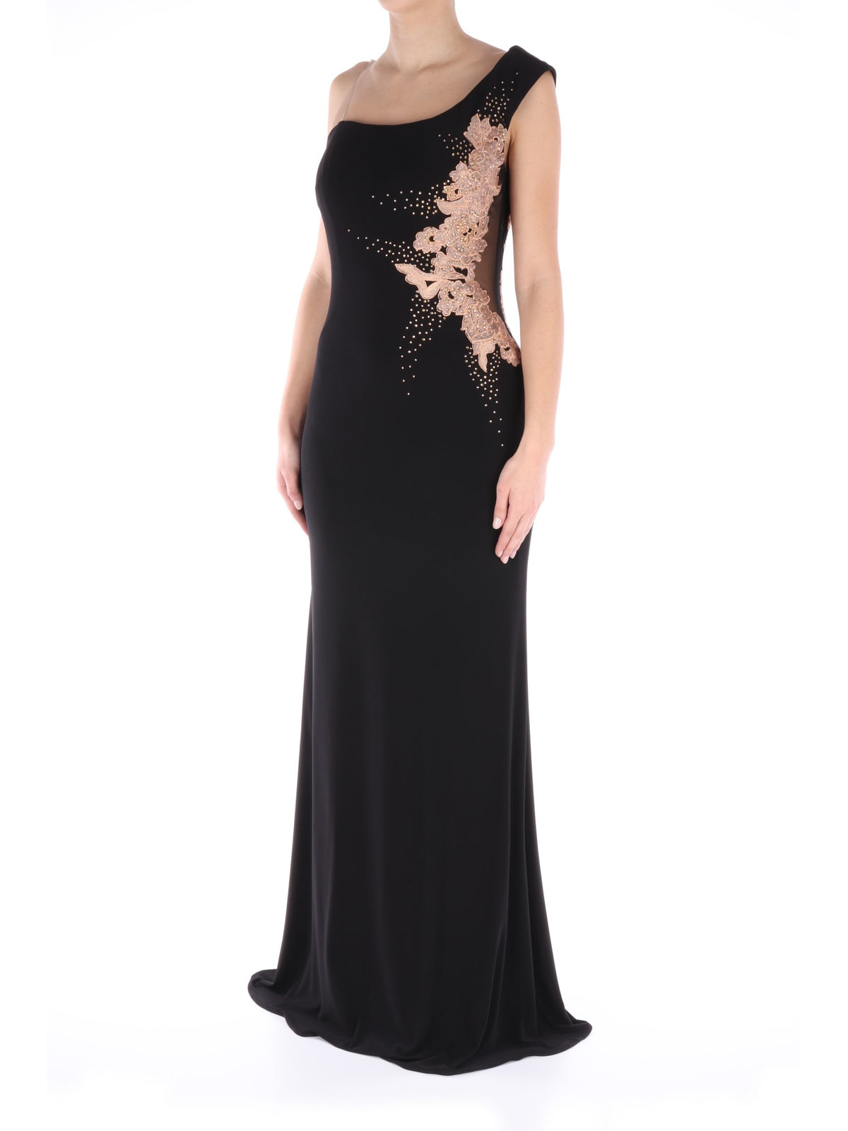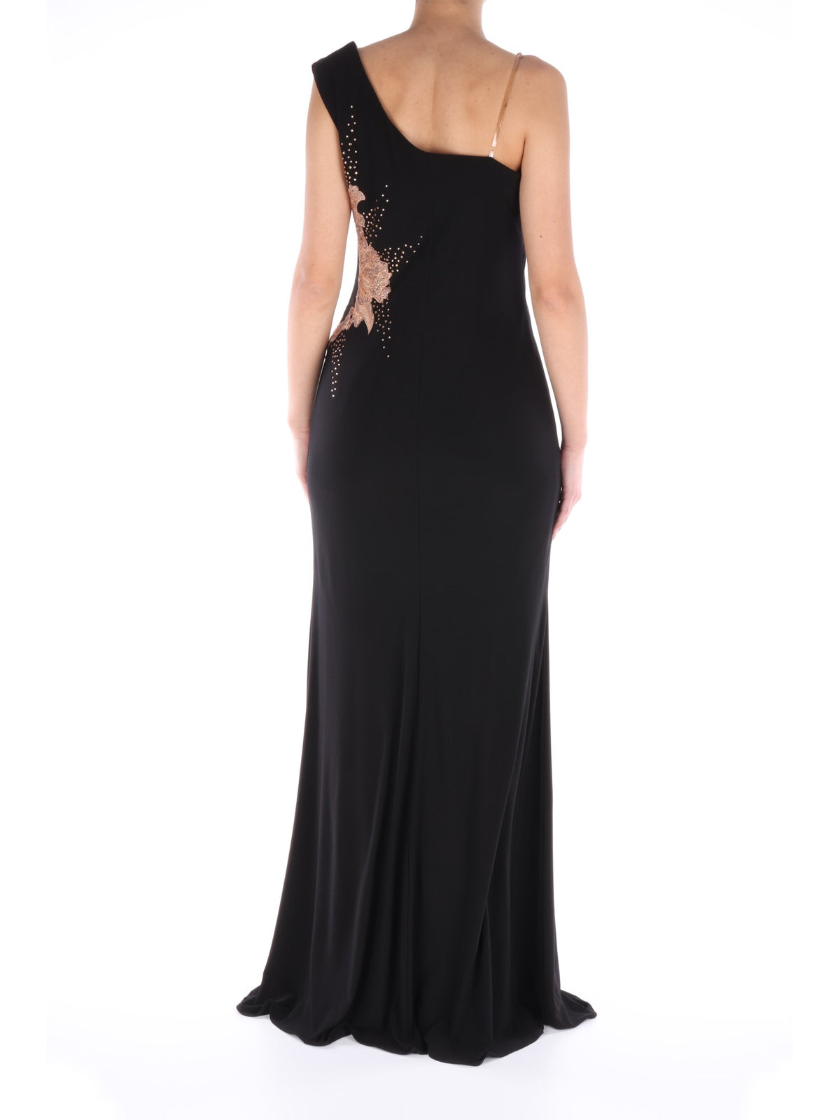 Abito nero lungo, con fodera nera in poliestere e stola nera in tessuto velato. Si caratterizza per lo scollo dritto con una spallina larga e una sottile invisibile, ricamo floreale color rosa antico, strass e tessuto velato sul fianco sinistro, sia sulla parte anteriore che posteriore, chiusura con cerniera nascosta sul lato destro e taglio classico leggermente scampanato nella parte inferiore. Risulta essere il capo perfetto per avere un look molto elegante, intramontabile e mai banale.