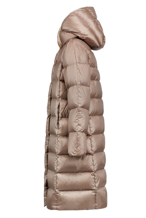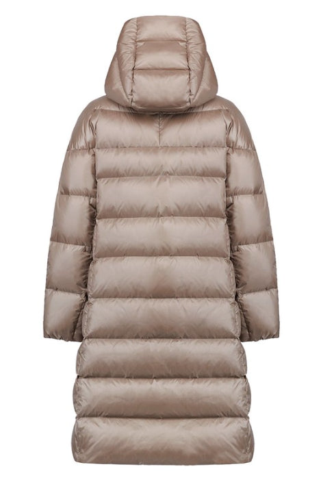 Piumino lungo in tessuto tecnico opaco color beige trapuntato