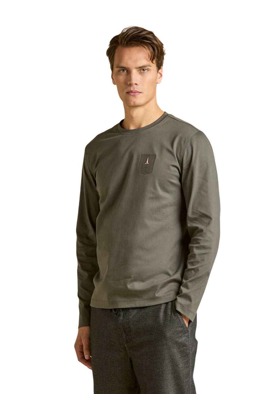Questa elegante t-shirt a manica lunga è realizzata in jersey di cotone stretch mercerizzato, un tessuto pregiato che regala al capo una finitura leggermente lucida e una maggiore resistenza nel tempo. Il design essenziale è arricchito da dettagli distintivi come la patch termo-applicata sul petto con l'emblema delle Frecce Tricolori, simbolo di eccellenza e precisione.
