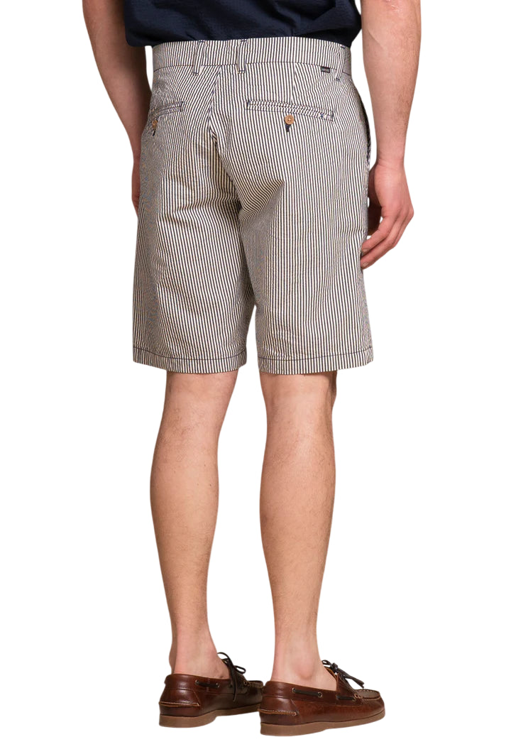 Chino short in tessuto seersucker a righe, leggero e traspirante, perfetto per affrontare le giornate più calde con stile. Il seersucker, con la sua texture increspata e le iconiche righe verticali, dona un tocco fresco e disinvolto. Il taglio chino assicura una vestibilità curata ma rilassata, ideale per look estivi casual ma ricercati.