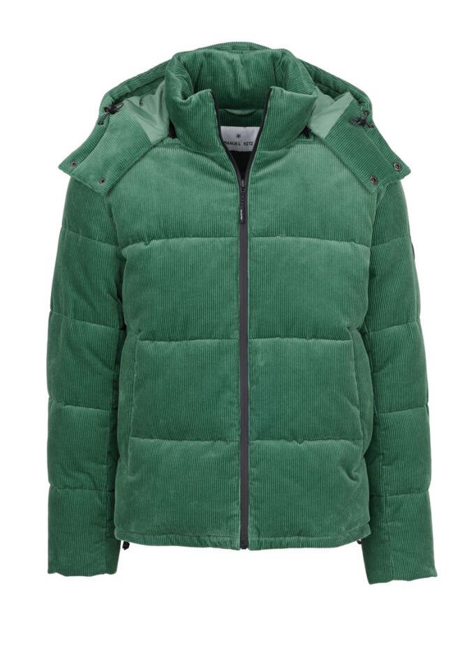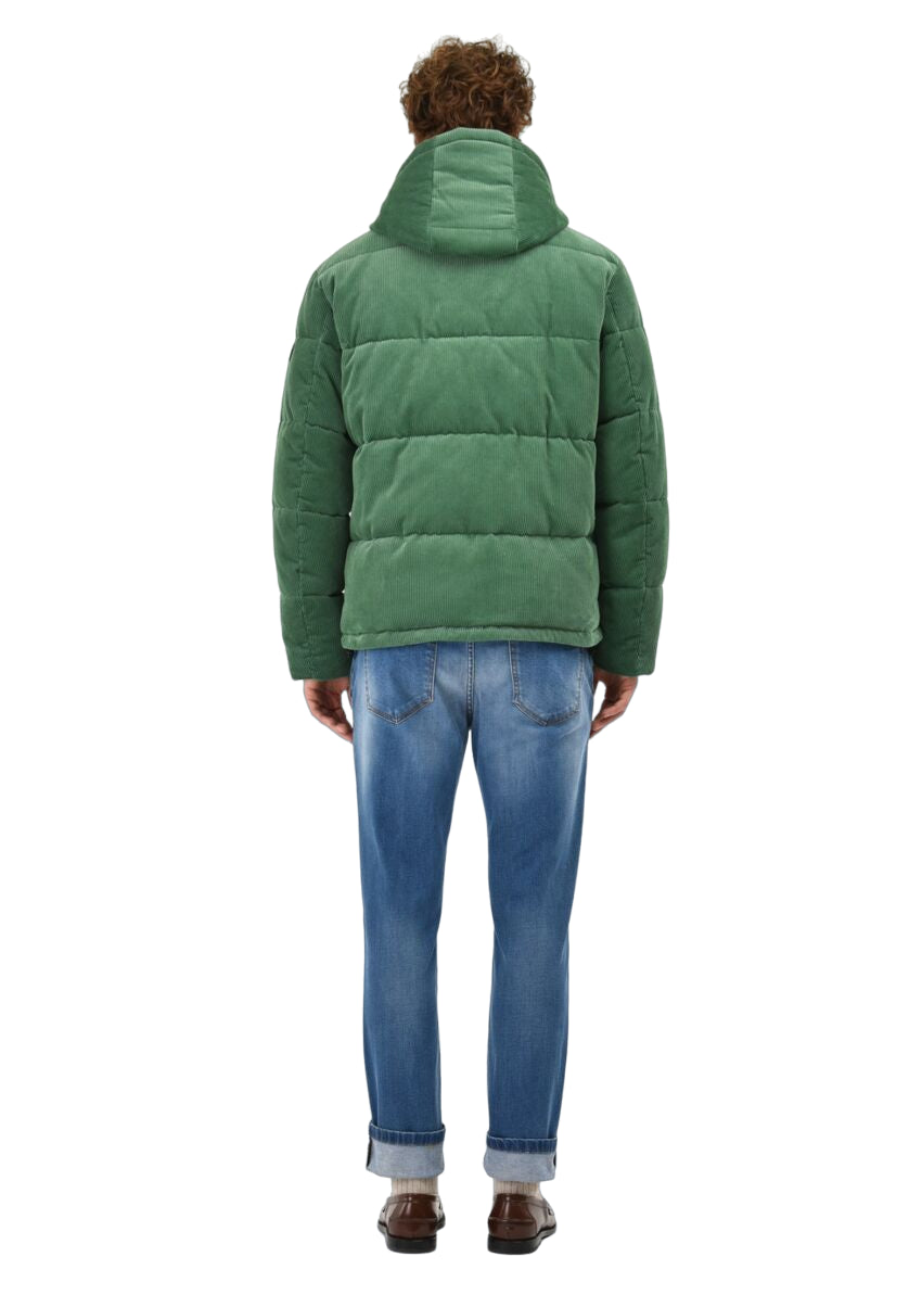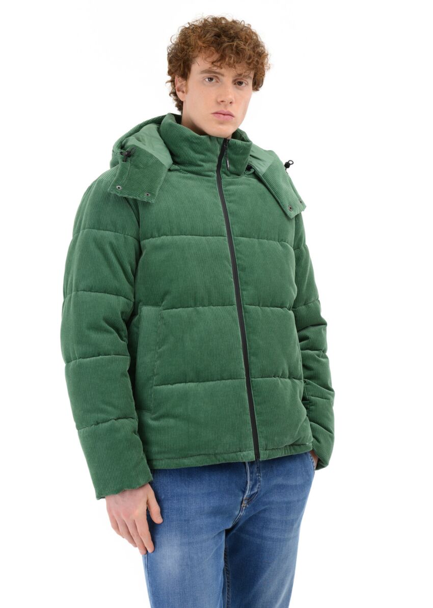 Piumino corto in velluto con cappuccio della nuova collezione autunno inverno 23 firmata Manuel Ritz. Presenta chiusura con zip, due tasche sul davanti. Velluto di cotone colore verde