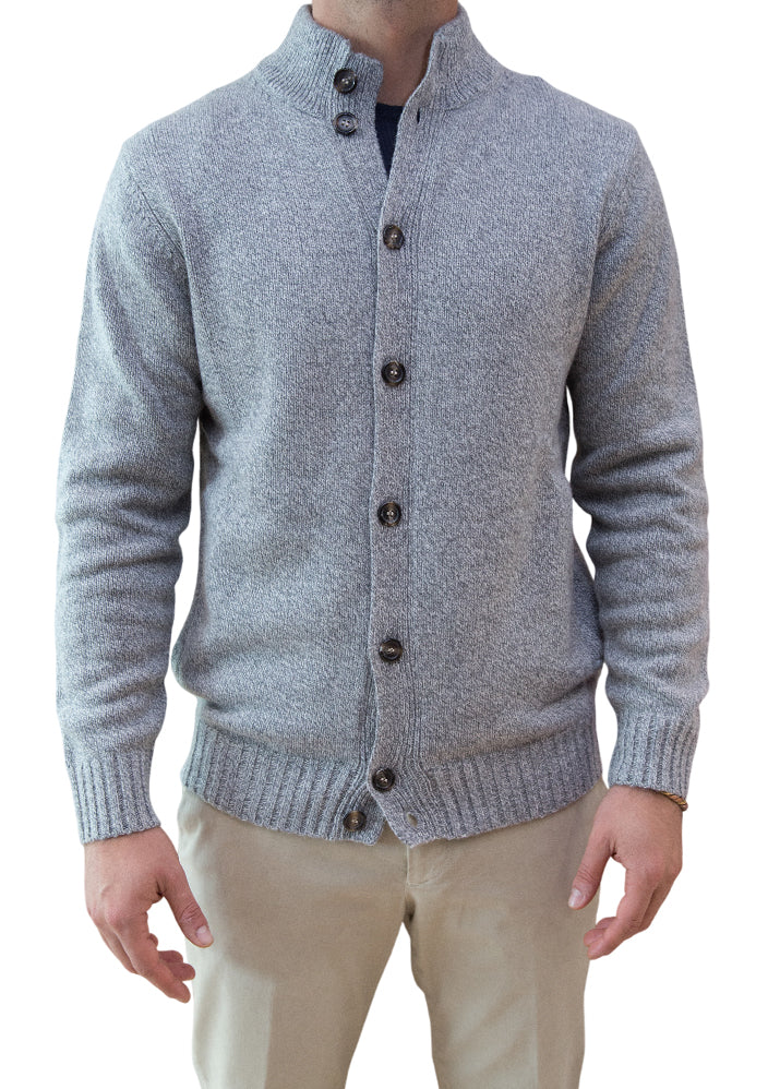 La scelta di materiali pregiati fa di questo cardigan Mark Midor un prodotto di grande eccellenza che abbina il gusto classico allo stile casual e metropolitano. Concepito e trattato artigianalmente in Italia, Mark Midor propone nella sua collezione autunno/inverno capi di prima scelta tutti unici nella loro produzione. Questo cardigan a collo alto è prodotto in un mix di lana merino, cashmere e seta e vestibilità regolare con fondo maniche e collo a larghe costine. Due tasche sui lati e chiusura a bottoni. Il modello in foto è alto 185 cm e indossa la taglia 50.