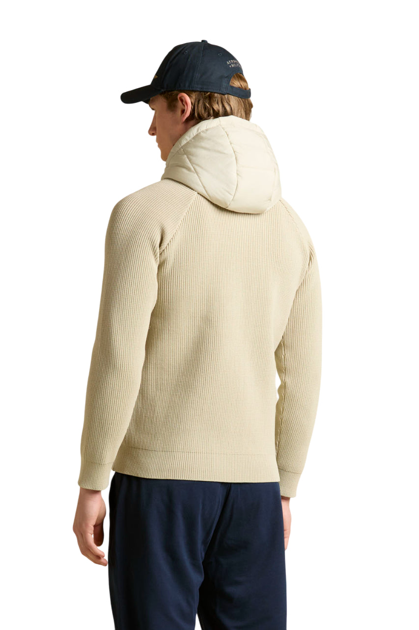 Una giacca dal carattere tecnico ed elegante, che unisce funzionalità e stile. Il design ibrido abbina il comfort della maglia a costa inglese, ispirata alla maglieria tradizionale, alla protezione del tessuto tecnico imbottito e trapuntato sul fronte e sul cappuccio. Perfetta per l'uso quotidiano e per affrontare le giornate più fresche, è valorizzata dalla patch termo-applicata delle Frecce Tricolori, simbolo di eccellenza e dinamismo.