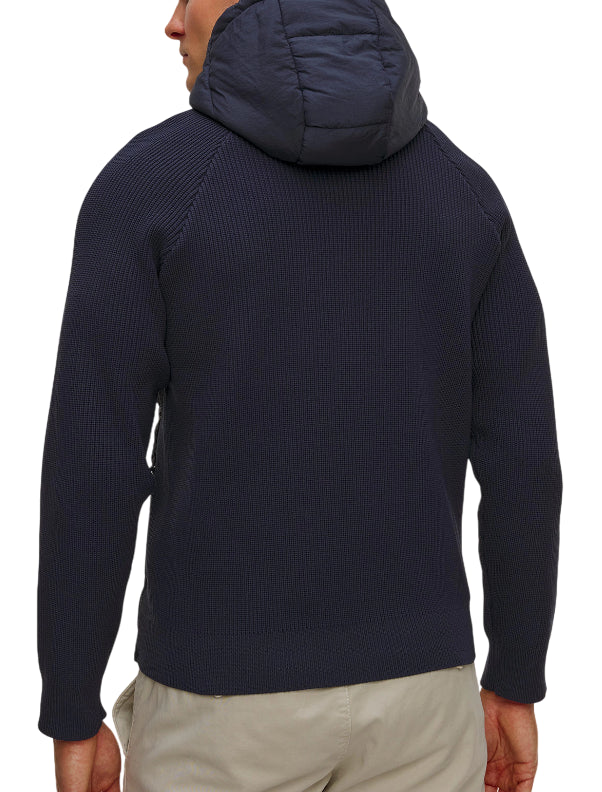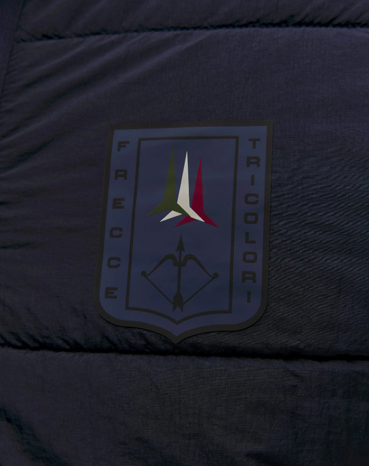 Una giacca dal carattere tecnico ed elegante, che unisce funzionalità e stile. Il design ibrido abbina il comfort della maglia a costa inglese, ispirata alla maglieria tradizionale, alla protezione del tessuto tecnico imbottito e trapuntato sul fronte e sul cappuccio. Perfetta per l'uso quotidiano e per affrontare le giornate più fresche, è valorizzata dalla patch termo-applicata delle Frecce Tricolori, simbolo di eccellenza e dinamismo.
