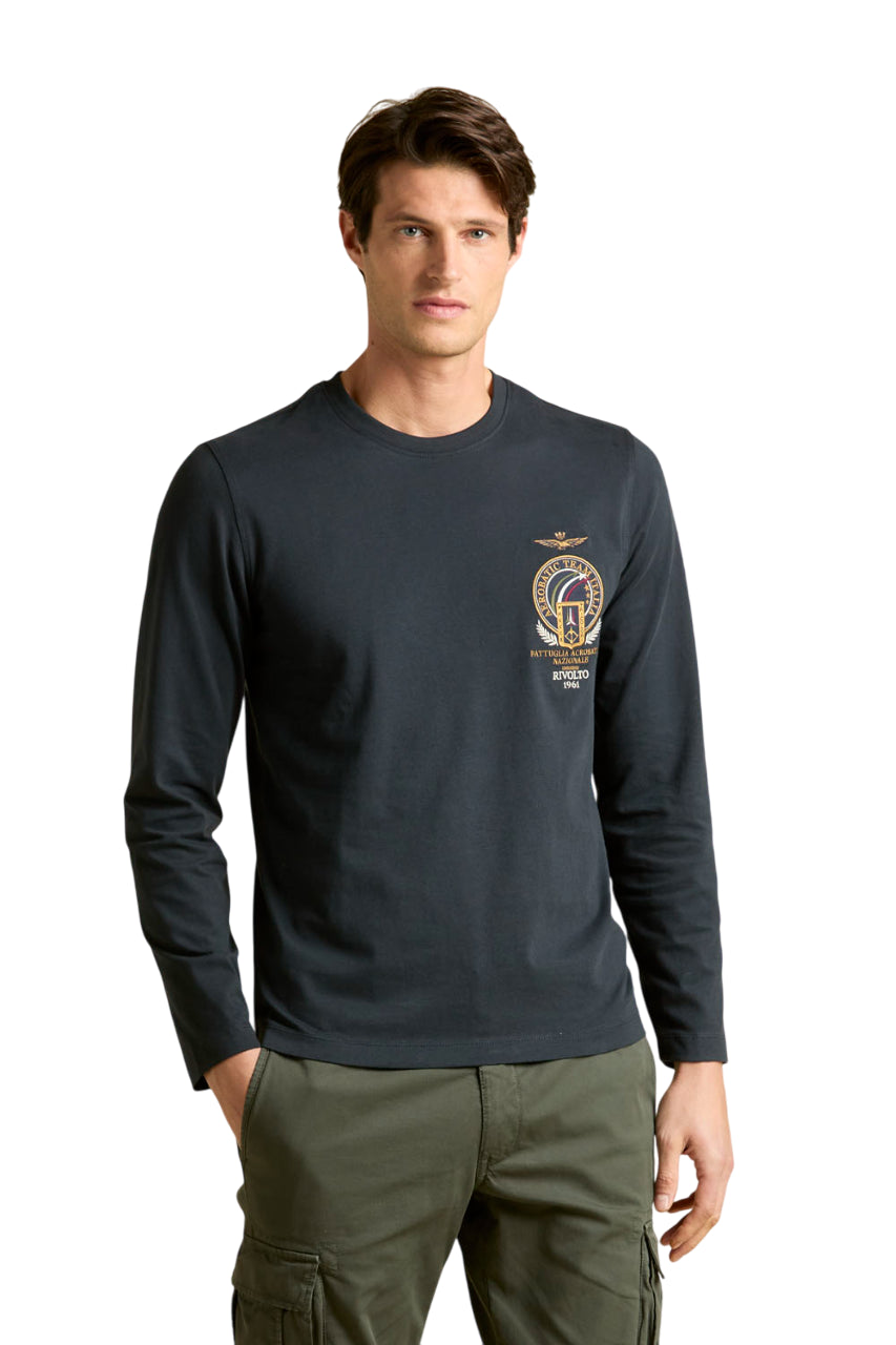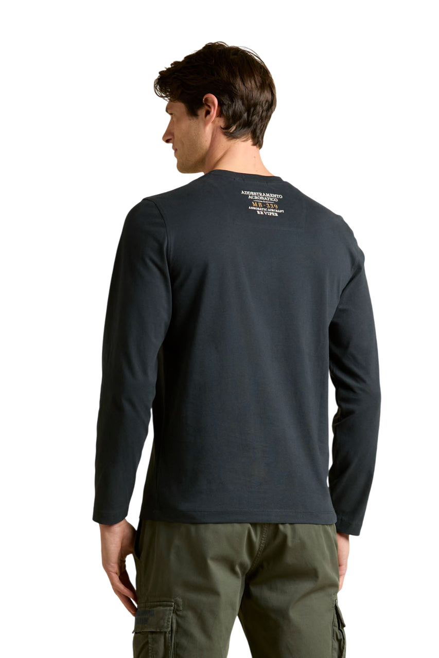 Questa t-shirt a manica lunga unisce un design pulito con dettagli ricercati. Il morbido jersey di cotone, sottoposto a trattamento di spazzolatura al carbonio, assicura una sensazione straordinariamente piacevole al tatto. A impreziosire il capo, due ricami dedicati alla Pattuglia Acrobatica Nazionale: uno sul petto e uno sulla schiena, per un effetto celebrativo che rende omaggio all'eccellenza italiana nel volo acrobatico.