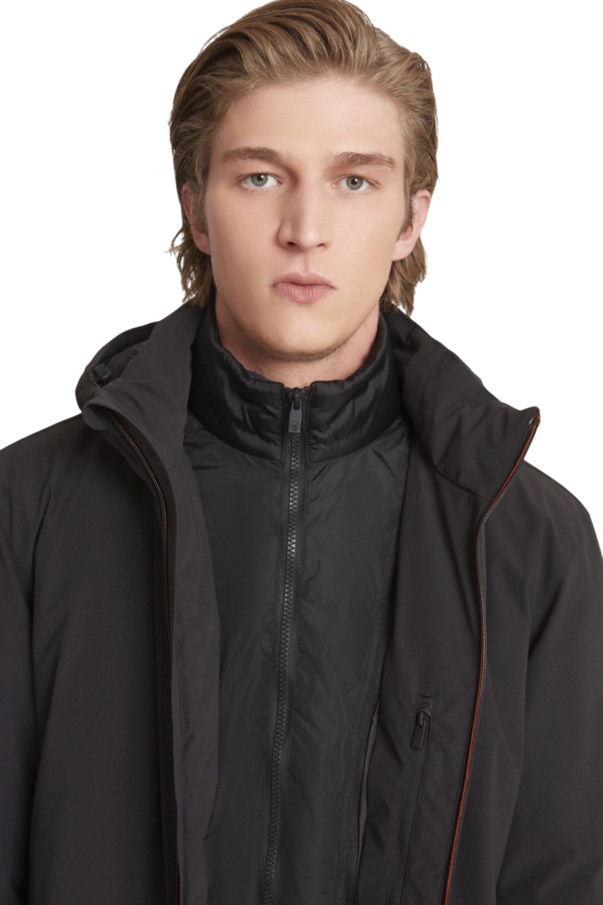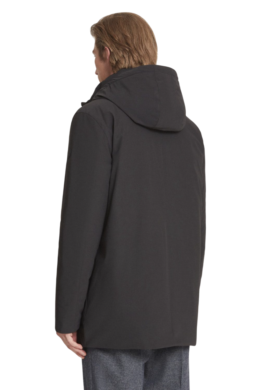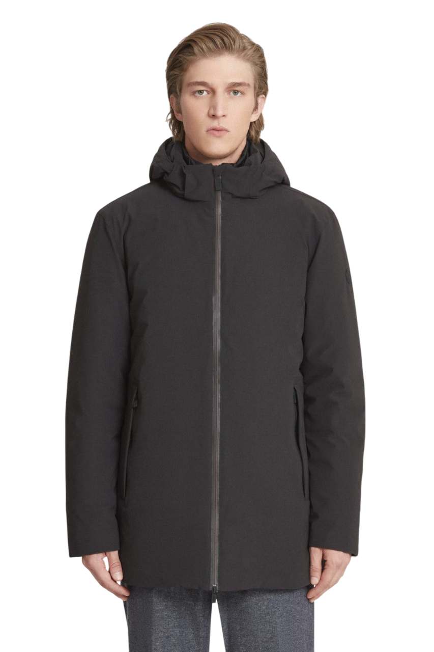 Giacca imbottita nera in tessuto softshell 2 layers e imbottita in vera piuma 80/20.
