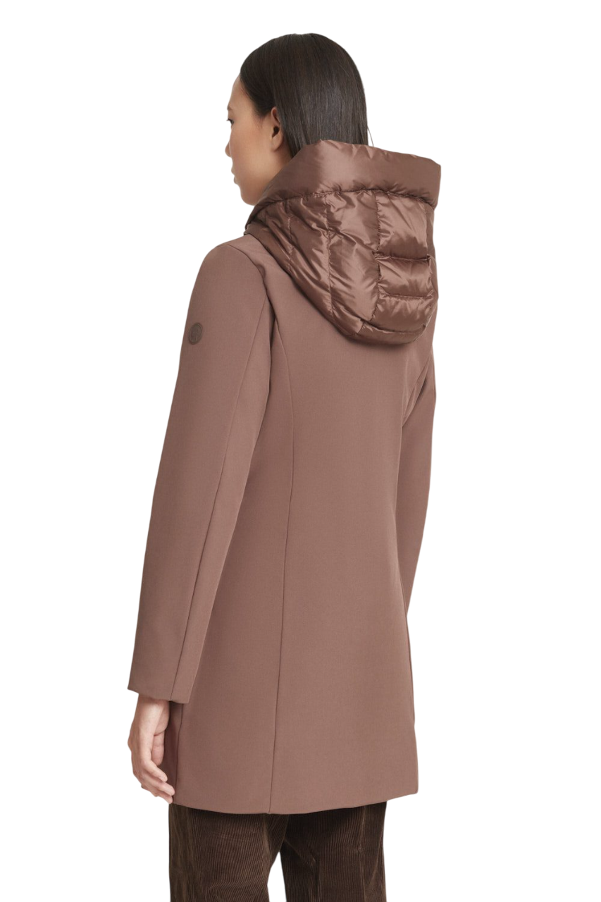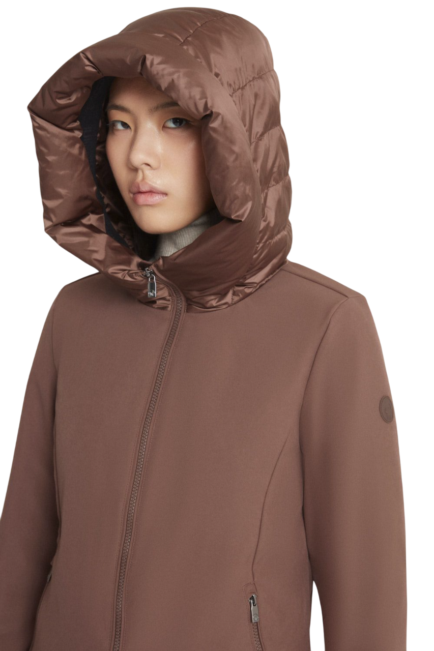 Giacca lunga marrone da donna, realizzata in tessuto softshell 3 layers con laminazione dry-tech e imbottita in vera piuma 80/20.