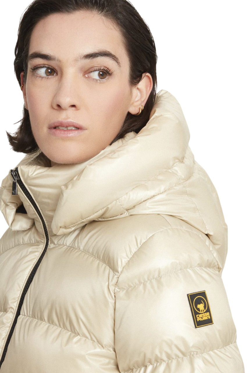 Piumino medio-lungo beige 200 grammi da donna con cappuccio staccabile, realizzato in tessuto microripstop lucido a trama nera e imbottito con vera piuma certificata 800 fill power, che assicura elevate performance termiche e leggerezza assoluta.