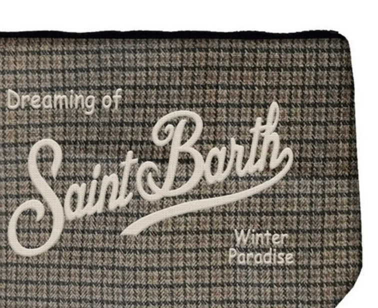 Descrizione: Pochette in flanella con interno in tessuto scuba. Manico singolo e zip. Logo St. Barth ricamato su entrambi i lati. Dimensioni: 20 x 14,5 x 7 cm. 70% SBR, 30% Poliestere