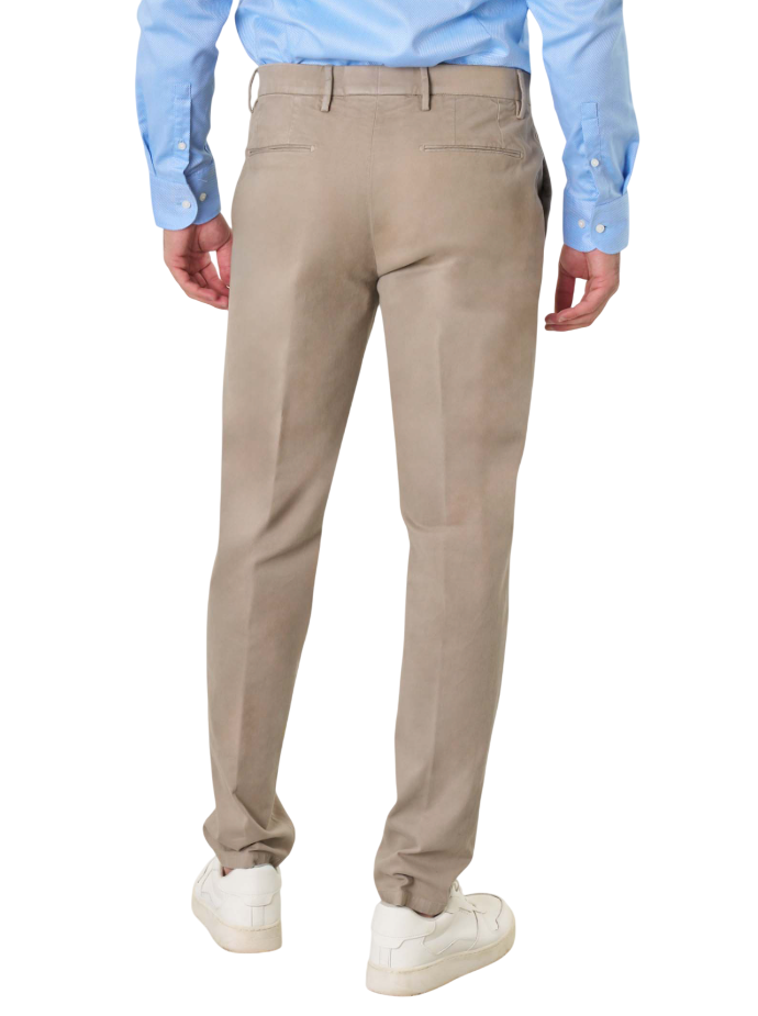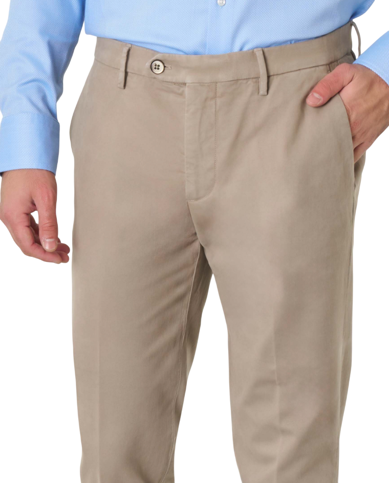 Pantaloni chino vestibilità slim in gabardina di cotone stretch a mano calda con tasche alla francese davanti, a filetto dietro. Chiusura con cerniera nascosta e cinturino con bottone.