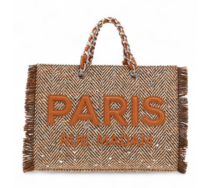 Tote Bag in tweed con pattern spinato con applicazione di borchie e strass all over, frange e logo PARIS in ecopelle. Manico con catena intrecciata e tracolla removibile. Tasca centrale in ecopelle con zip e fodera interna in cotone con tasca. L 24 H 19 P 10