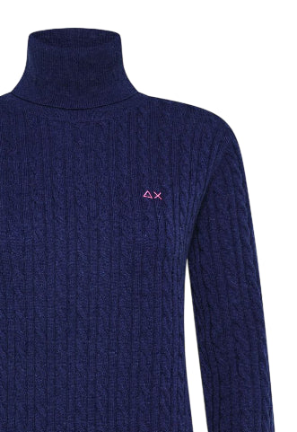 SUN68 MAGLIONE DOLCEVITA IN LANA E CASHMERE A TRECCE BLU PROFONDO