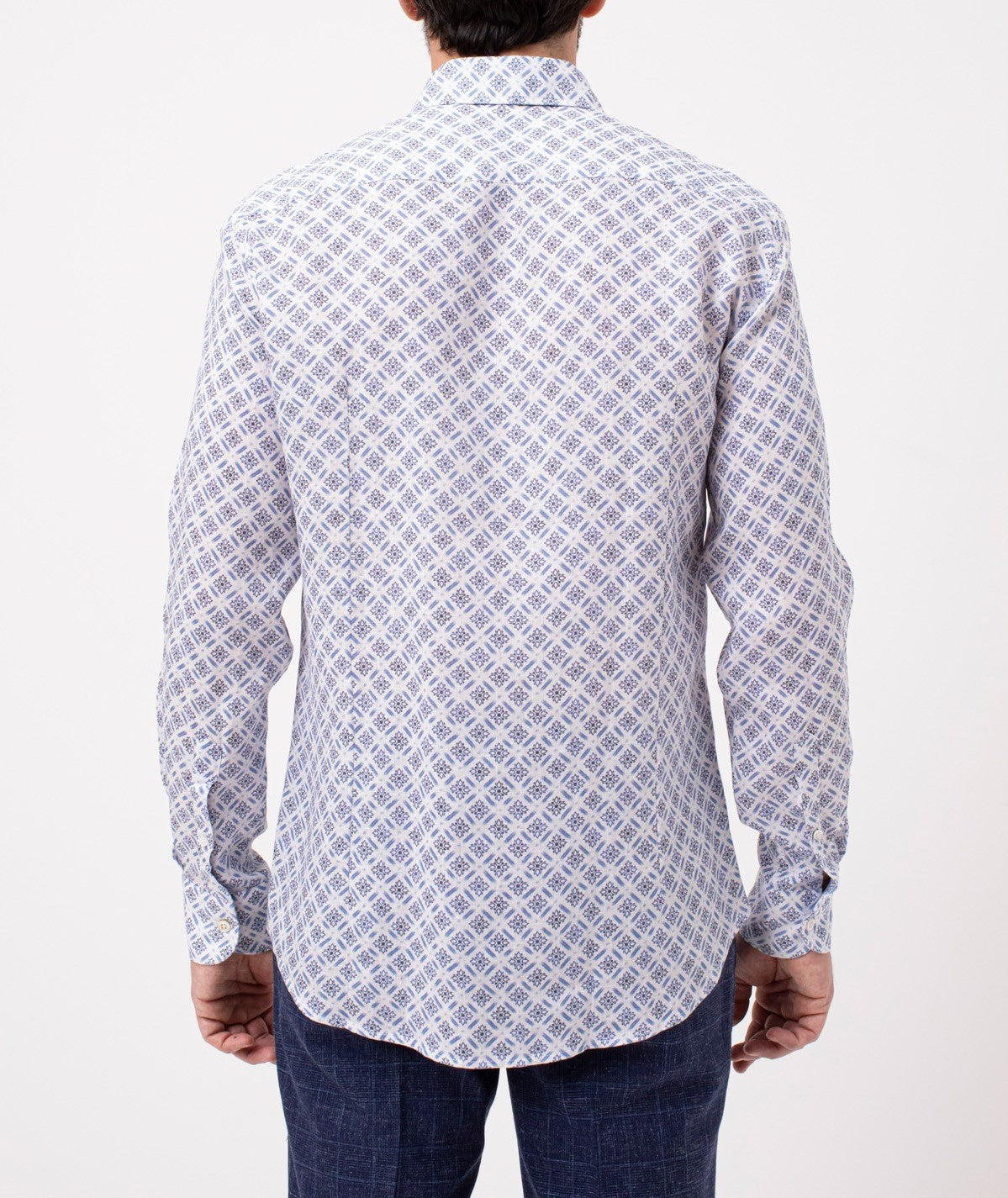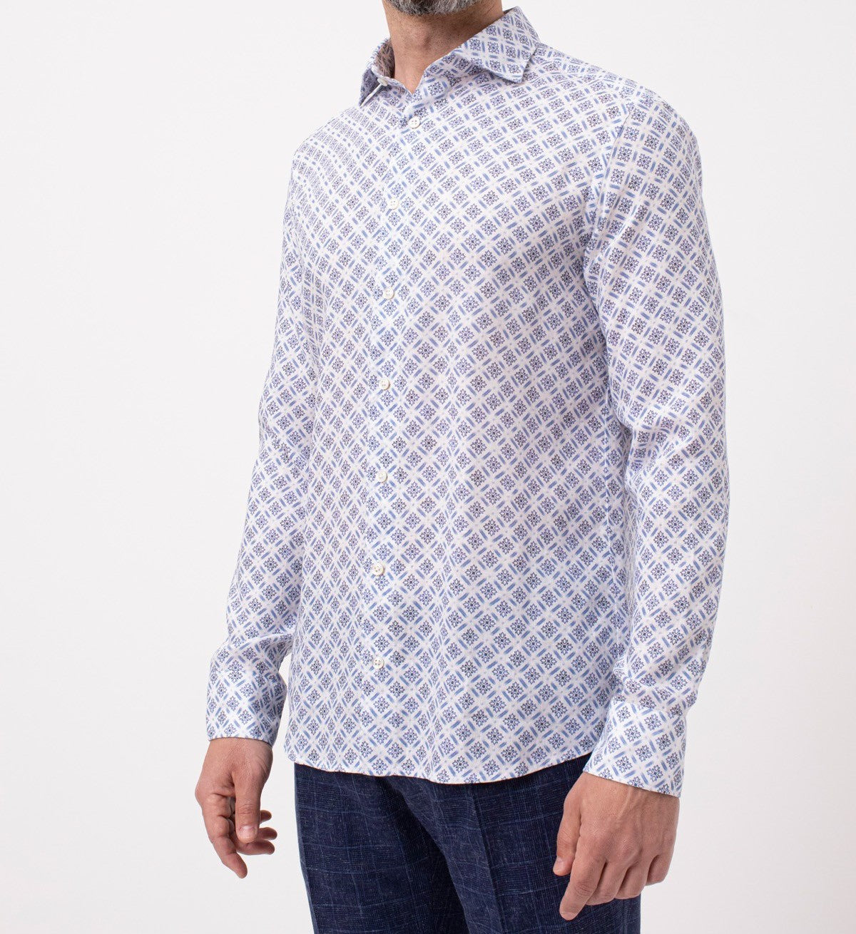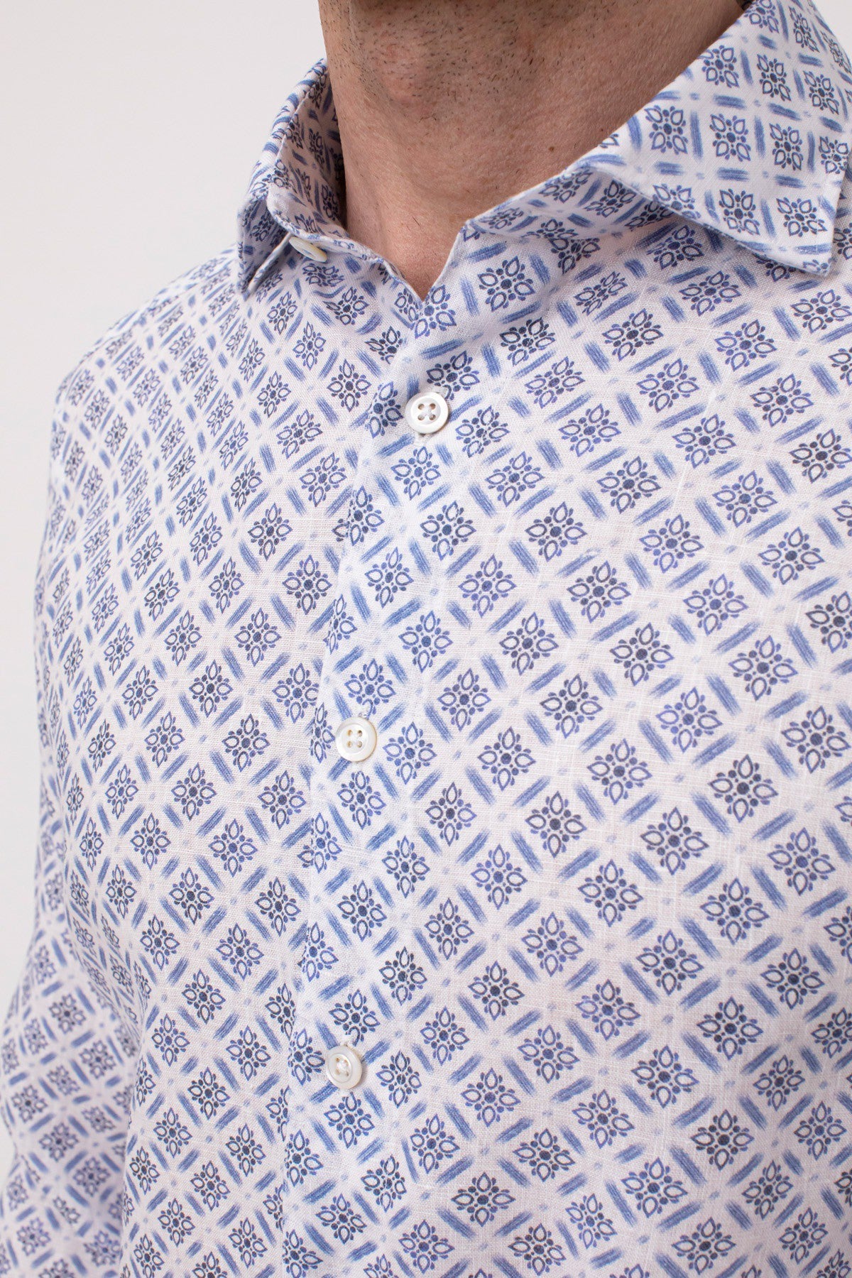 Camicia con maniche lunghe. In puro lino. Fondo bianco con pattern geometrico azzurro. Abbottonatura liscia. Colletto alla francese. Carré cucito separatamente. Polsini arrotondati. Pinces sul retro. Made in Italy.