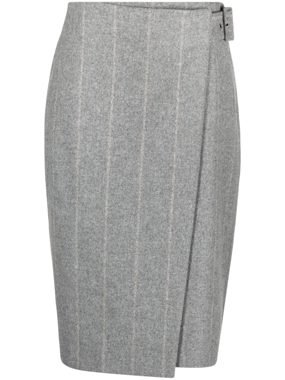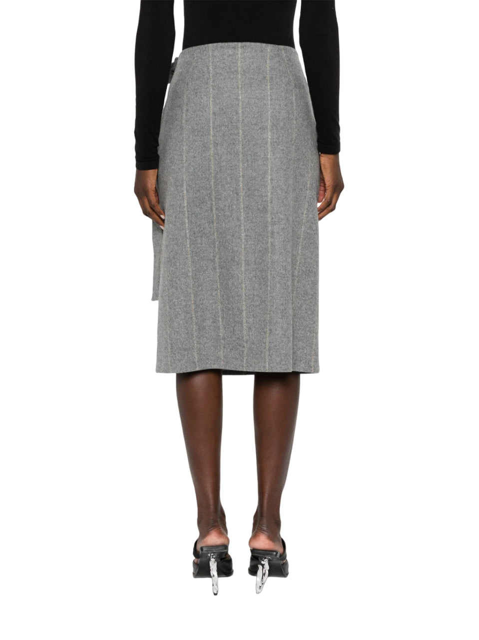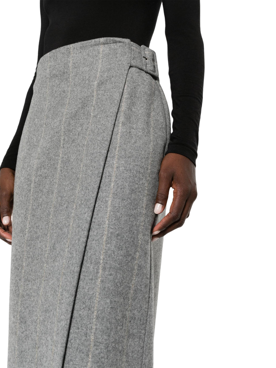 Grigio chiaro, lana merino, motivo a righe verticali, vita alta, design a portafoglio, chiusura laterale con fibbia e lunghezza media.