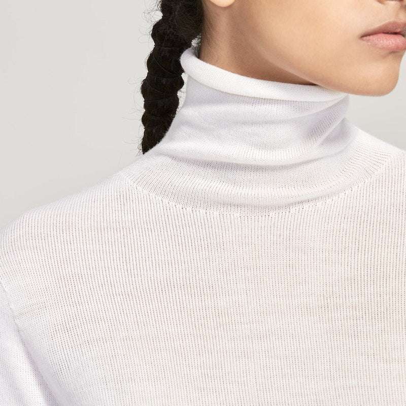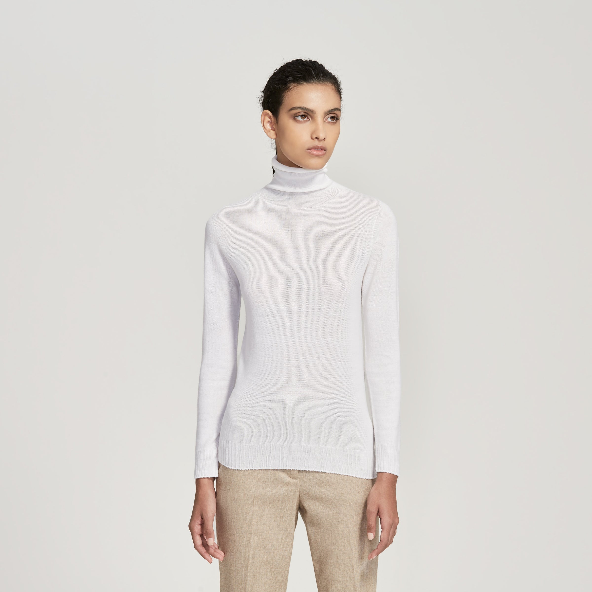 Una maglia calda e raffinata presentata nella nuova collezione autunno/inverno 22-23 di Fabiana Filippi. Un prodotto evergreen per uno stile che resiste alle stagioni. Questa maglia collo a lupetto è realizzata in pura lana merino ed è ideale per animare look quotidiani con la sua linea slim e la sua elegante classe. La modella è alta 1,78cm e indossa la taglia 40