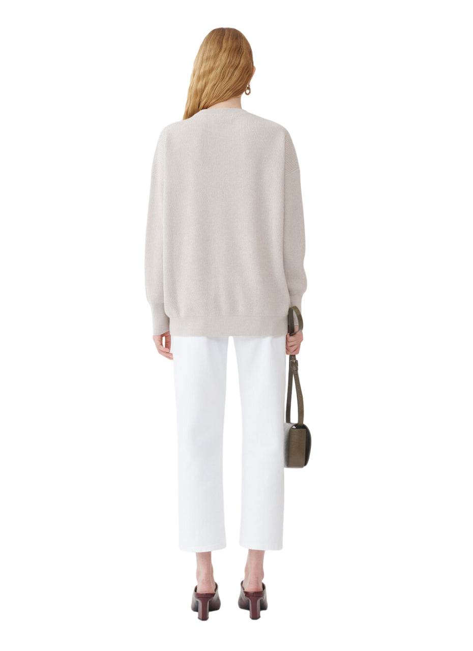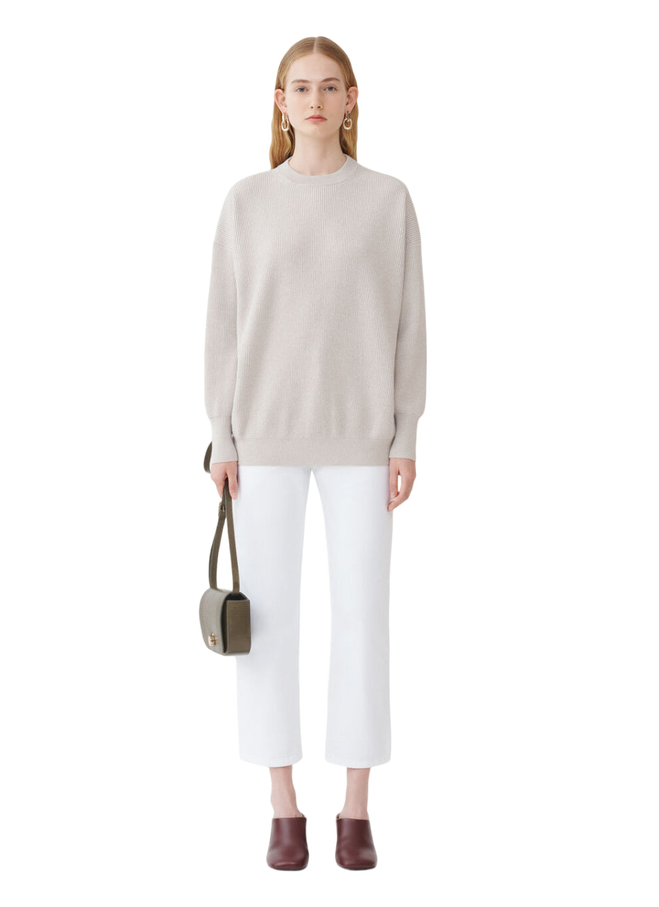 La maglia girocollo in Platinum con brillante lurex a costa inglese combina la versatilità del filato con un aspetto luminoso.