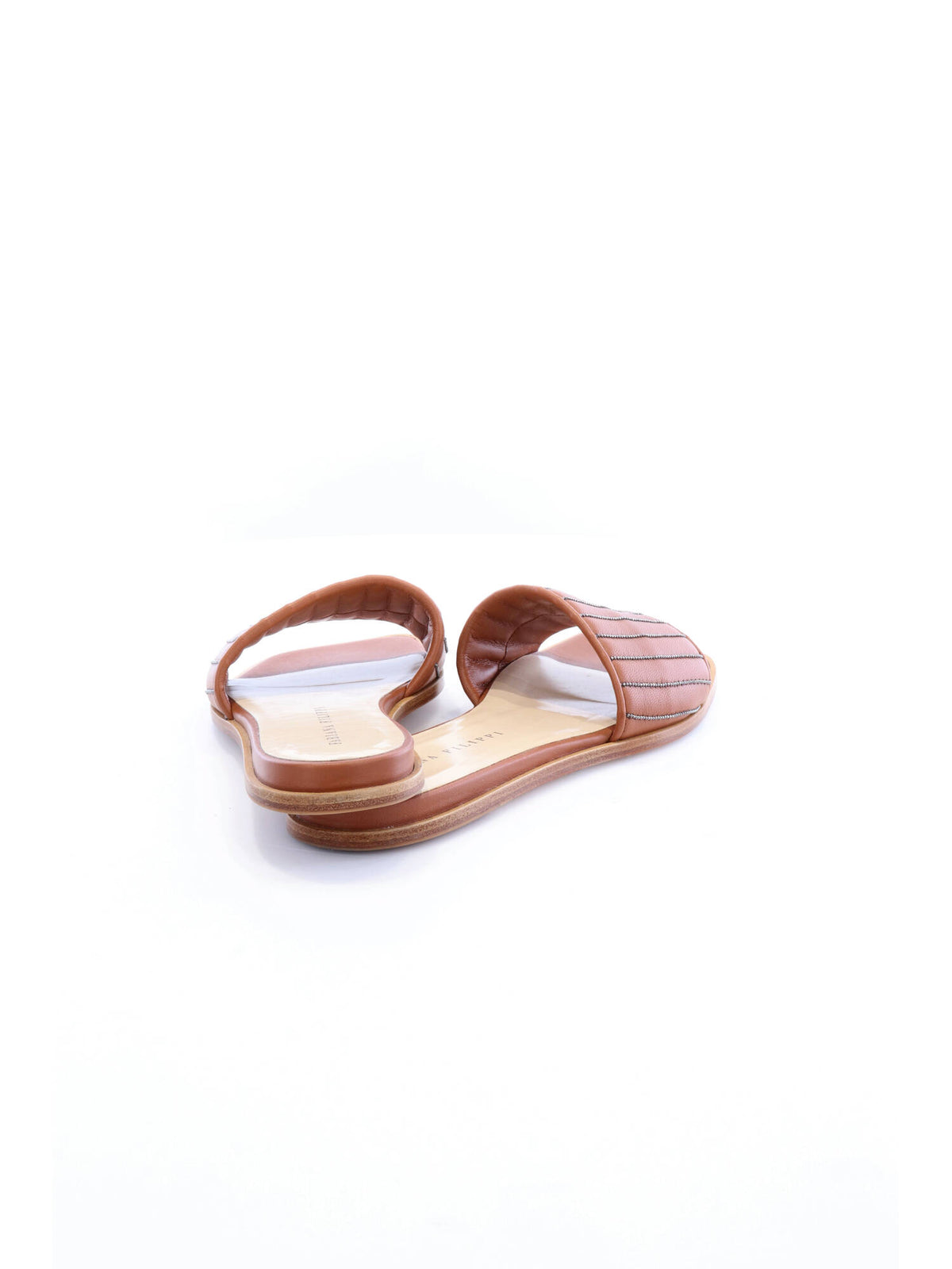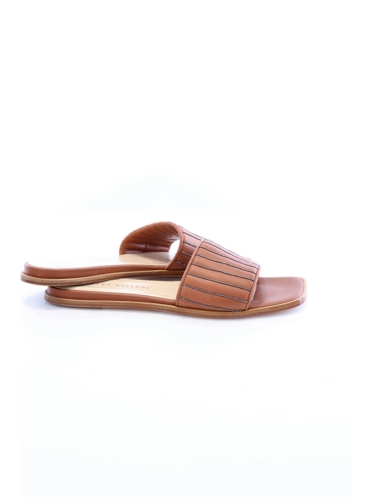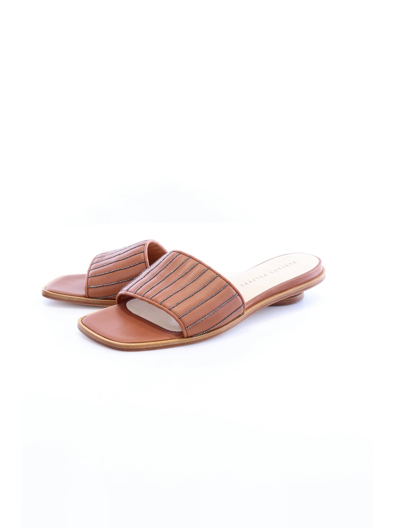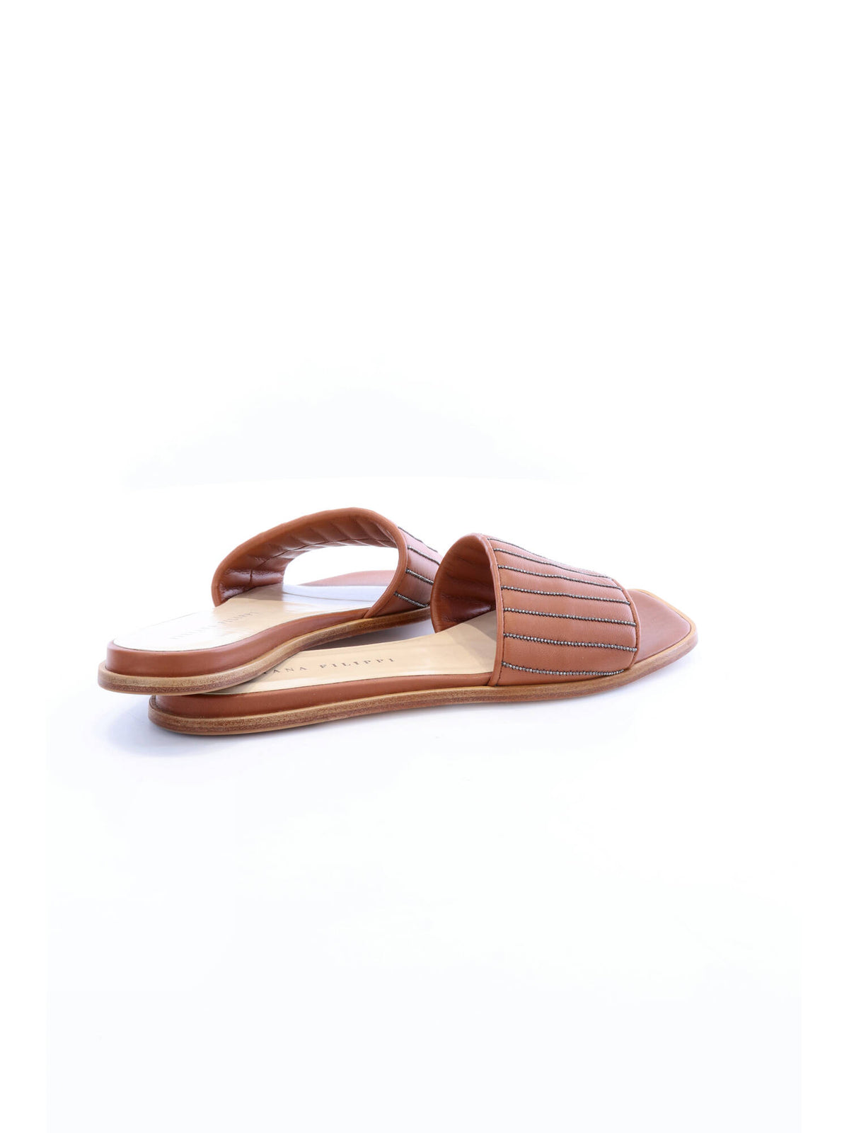 Il designer e il tocco di Fabiana Filippi è pienamente espresso anche in questo prodotto dalla linea chic e raffinata. Un sandalo aperto in cuoio marrone impreziosito da dettagli di luce a righe sulla parte superiore del prodotto. Suola piatta in pelle e soletta con logo aziendale. Per la donna che ama vivere con stile e ricercatezza.