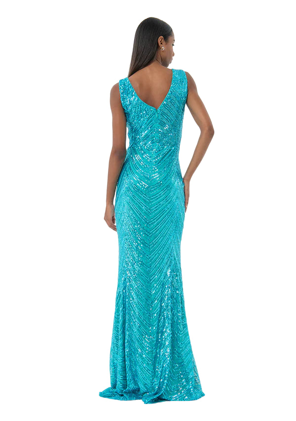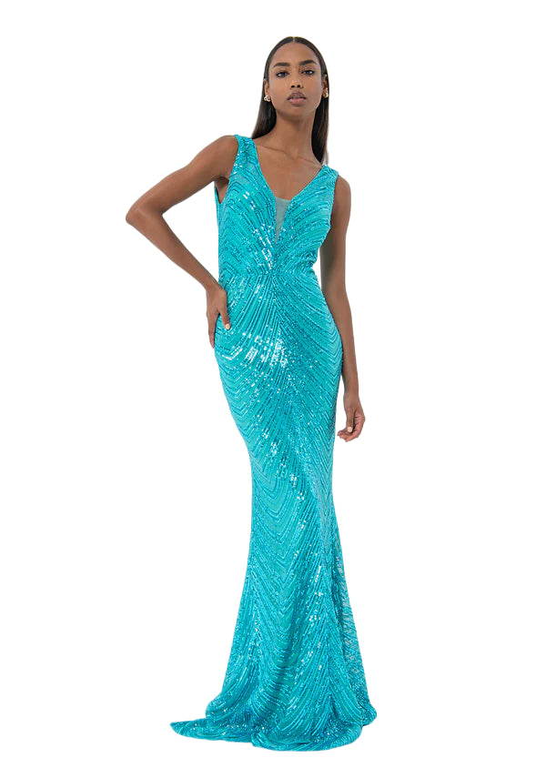Abito slim lungo con paillettes luminose, scollo a V, senza maniche, e con gonna svasata.