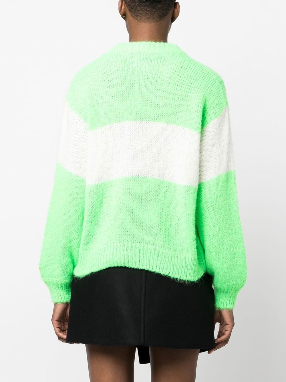Una calda e morbida proposta della collezione autunno/inverno 22 firmata Mc2 Saint Barth. Un pratico maglione con lavorazione spazzolata, che presenta una vistosa riga bianca su fondo verde chiaro e la maxi scritta Verbier sul davanti e sulle maniche. Girocollo, fondo e maniche ad ampie coste. La vestibilità è regolare.