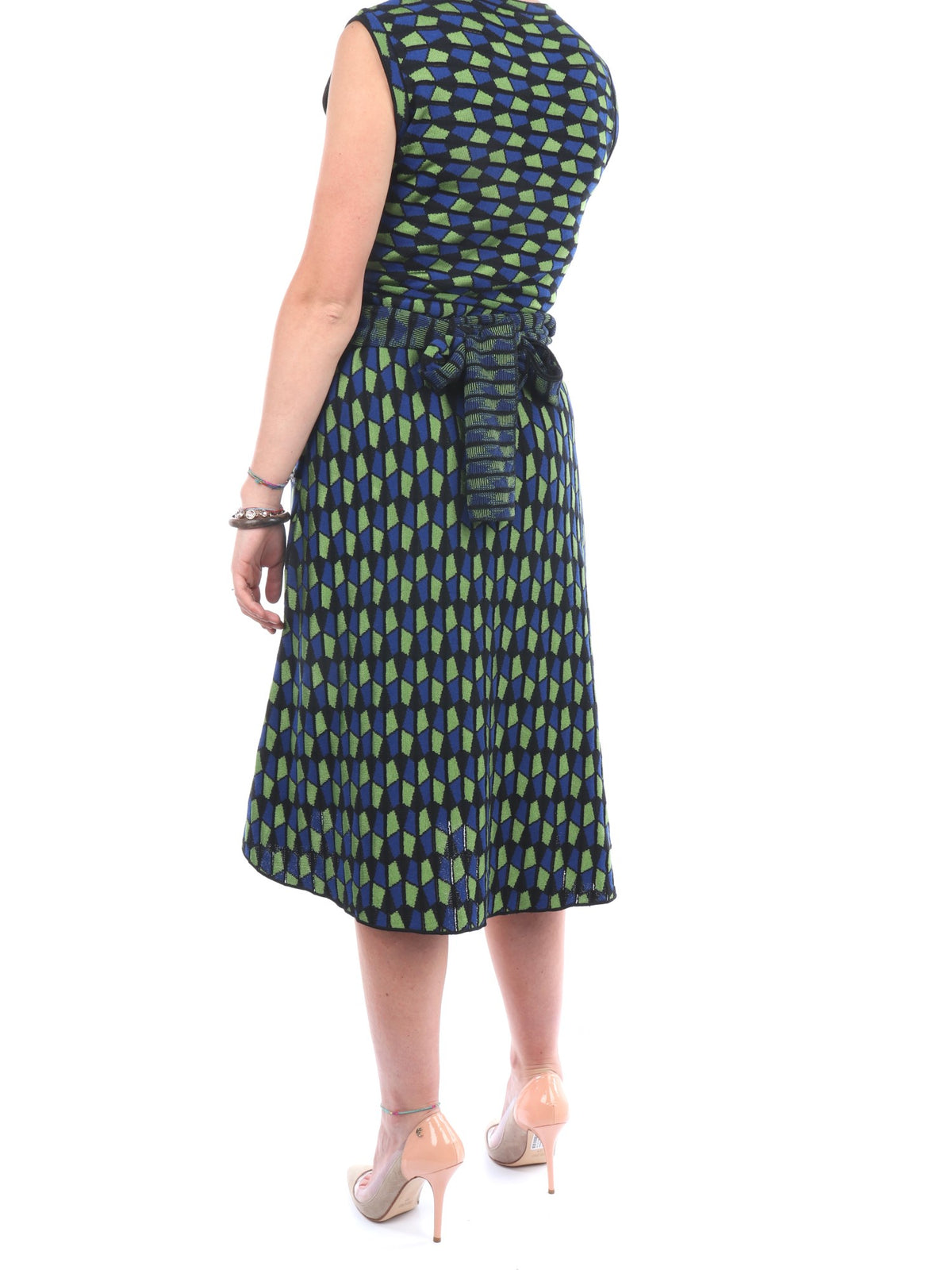 Eleganza, stile e gusto raffinato per questa proposta unica ed innovativa di Angela Missoni. Un abito per la donna al passo con i tempi che completa il suo guardaroba con una proposta sensuale e dal tocco vivace. Il capo è il classico abito lunghezza polpaccio ma con il tocco unico che solo Missoni riesce ad imprimere, fantasia multicolore nero verde prato e bluette con scollo tondo, chiusura regolabile con fusciacca in fantasia a tono e allacciatura sul retro. La modella in foto è alta 165 cm per un peso di 53 Kg e indossa la taglia 40.
