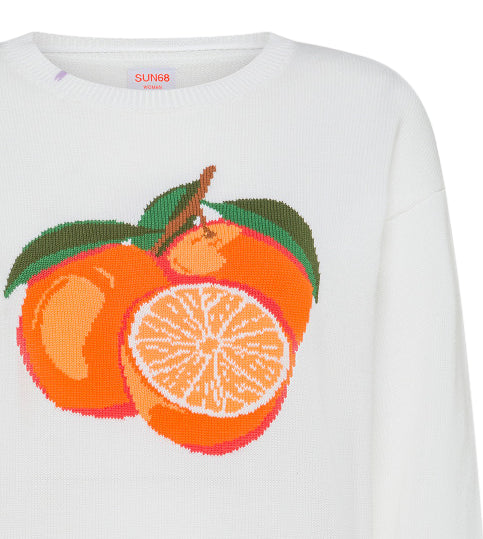 Maglia girocollo a maniche lunghe della nuova collezione p/e 24 firmata SUN68 con fantasia arance ricamata sul fronte in colore a contrasto e dettaglio a contrasto ricamato sul collo e su un polsino.