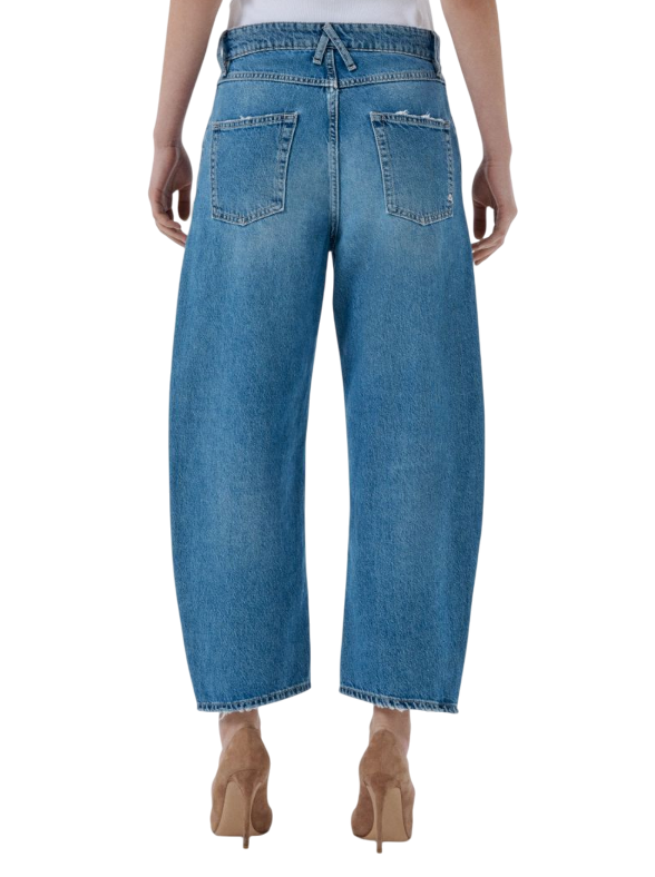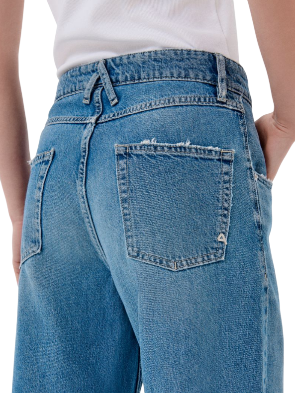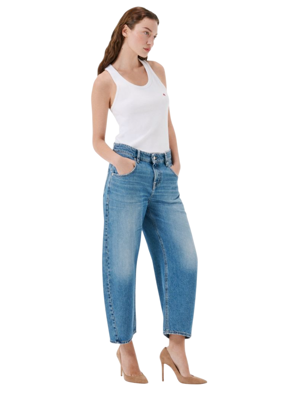 Aida è un jeans crop super fitted, effetto curvato sulle gambe e dal tono vintage nel colore blu naturale. Il tessuto è rigido, la composizione è 80% Pure Cotton 20% Re-Cycled Cotton.