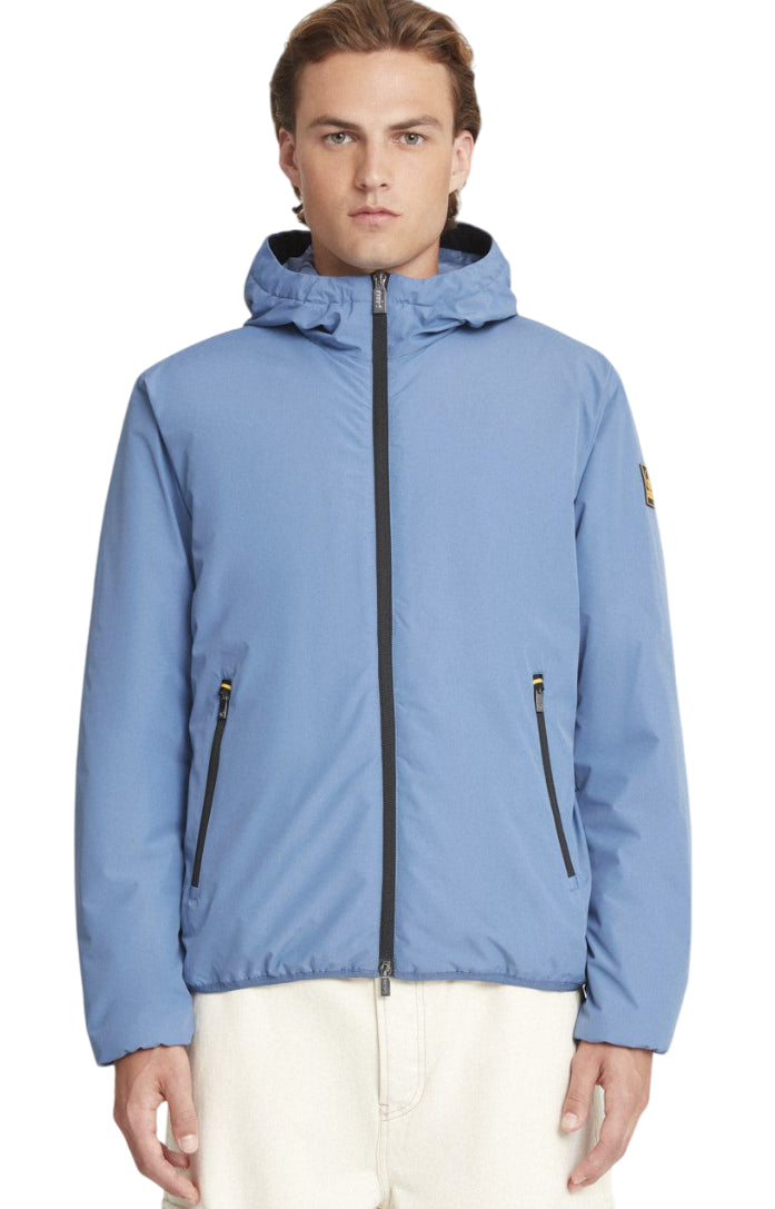 Giacca imbottita azzurra da uomo con cappuccio, dal design semplice e pulito.