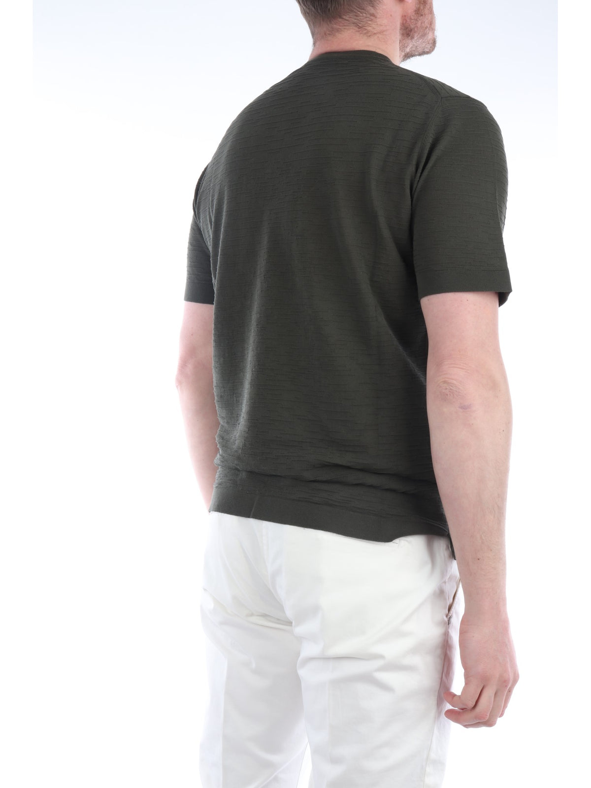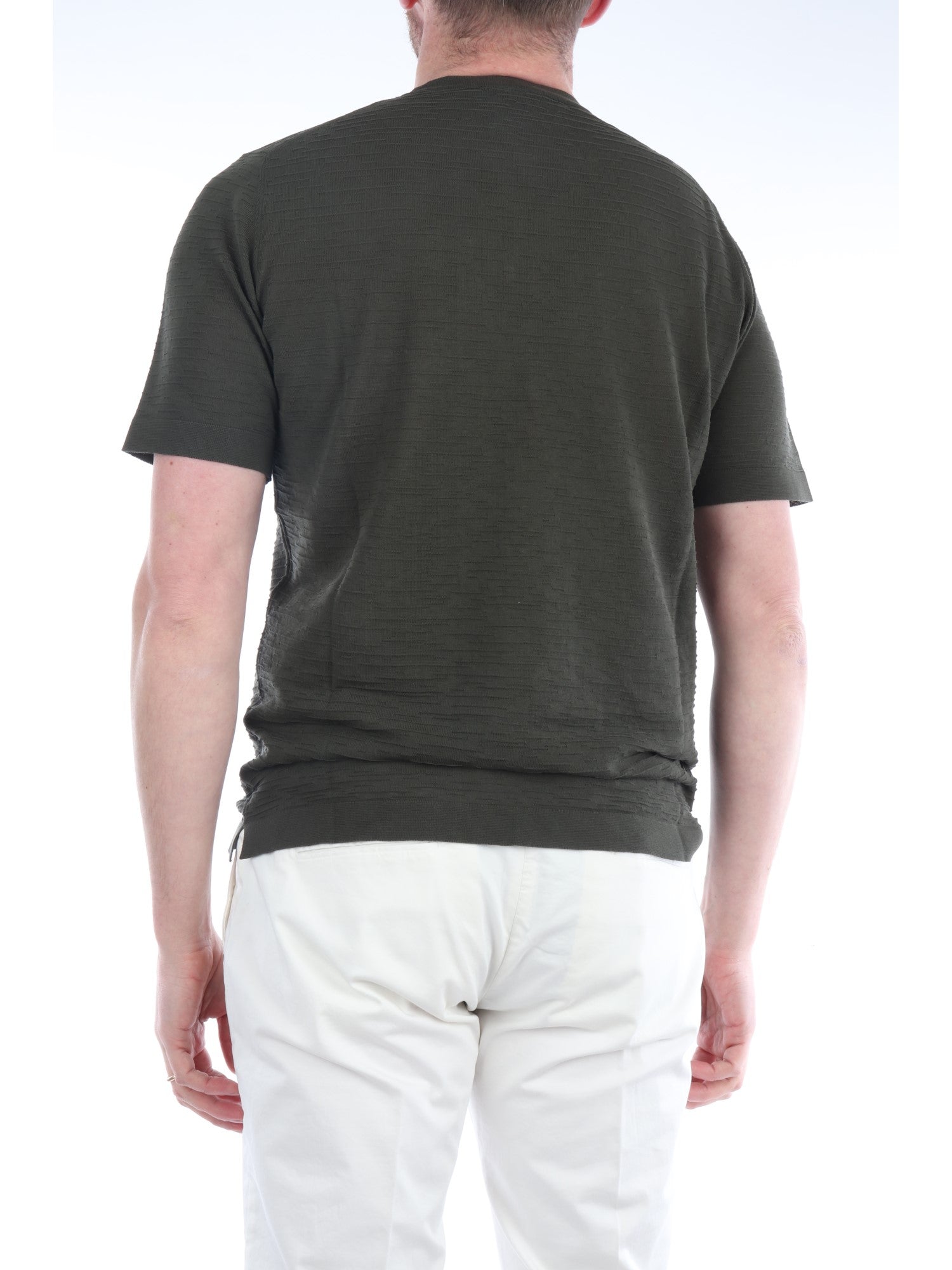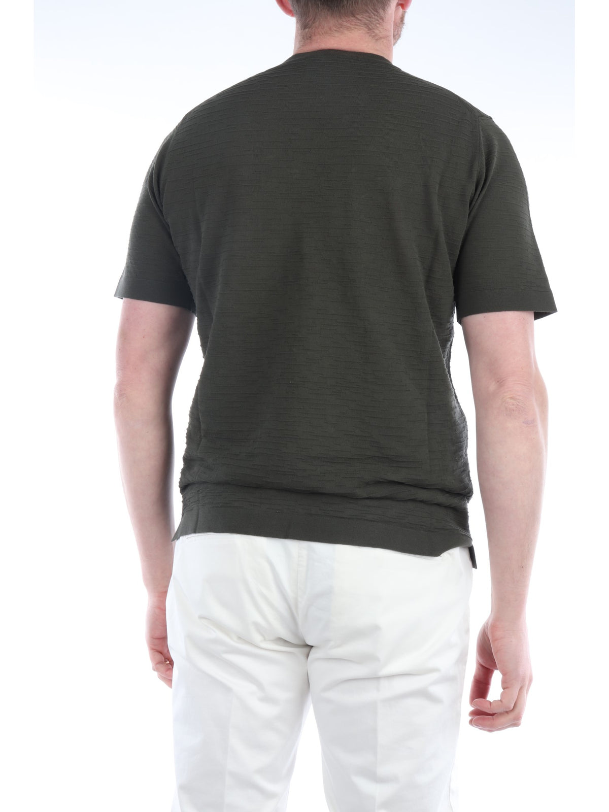 Le t-shirt firmate Filippo De Laurentiis si contraddistinguono per la pregiata lavorazione dei tessuti che rendono questi capi unici e ideali per l'uomo che non vuole rinunciare allo stile e all'eleganza anche indossando una semplice maglietta. Realizzata in cotone al 100% ha una trama tessuto a rilievo e a righe, sottili costine sul girocollo e sul fine manica. Il fondo è il verde militare e per questo il prodotto è versatile e idoneo ad un abbinamento sia sportivo che casual se abbinato ad un blazer o ad un pantalone classico. Il modello in foto è alto 182 cm e indossa la taglia 50.