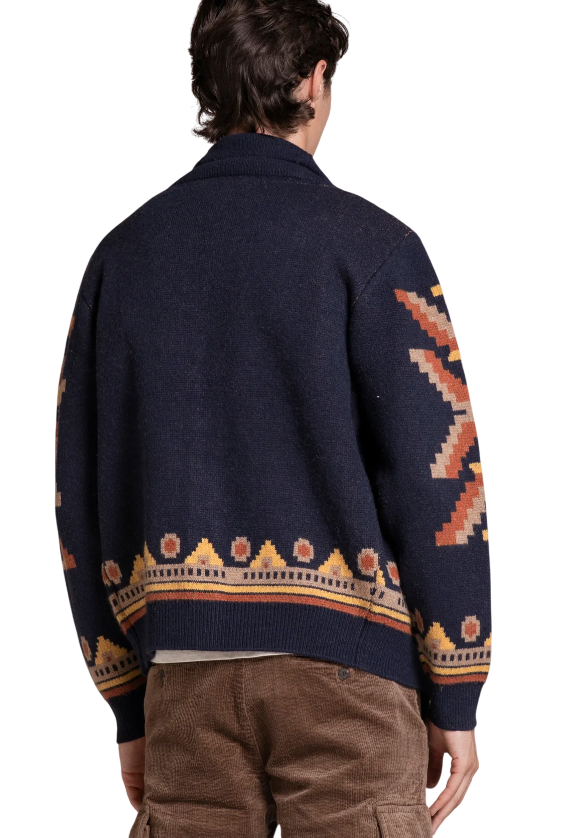 Cardigan dal design avvolgente, realizzato in caldo misto lana, caratterizzato da collo sciallato che esalta lo stile rilassato e accogliente del modello. La lavorazione jacquard con motivo Navajo dona un carattere deciso e ricercato, ispirato alle suggestioni etniche. La chiusura frontale con bottoni completa il capo, unendo praticità e dettagli di stile. Versatile e distintivo, è perfetto da abbinare a look casual quotidiani o a outfit più ricercati per un tocco autentico e contemporaneo.