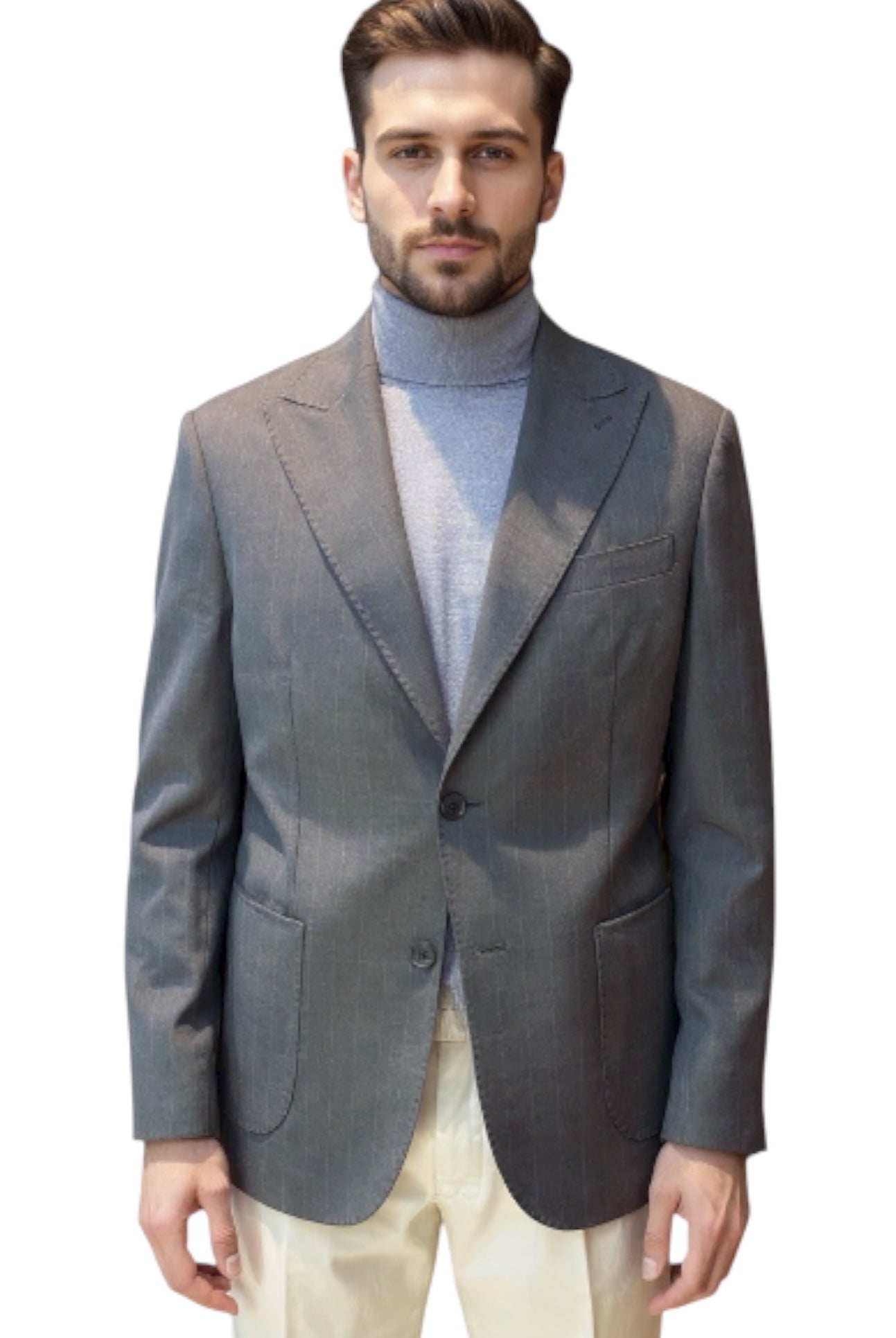 Mark Midor presenta per questa collezione autunno inverno questa fantastica giacca in misto lana, realizzata artigianalmente in Italia con la massima attenzione ai dettagli. Fantasia gessata, monopetto a due bottoni, tasche a toppe sui fianchi e revers a punta di lancia. Qualità e stile made in Italy firmato Mark Midor. Composizione: 60%lana 38% viscosa 2% elastane