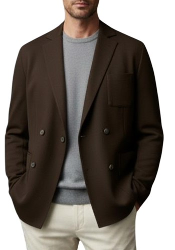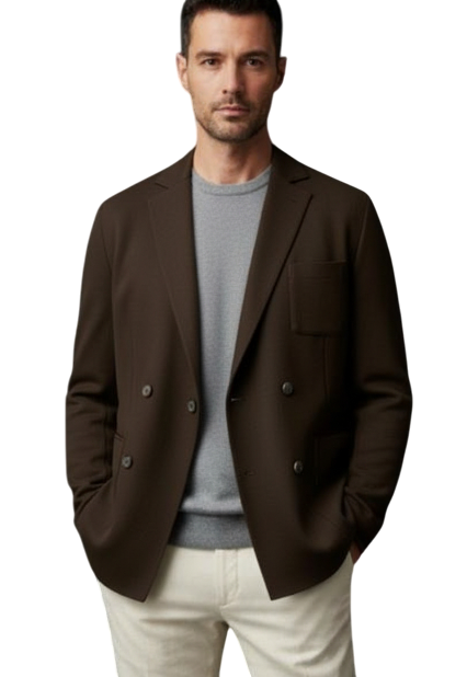 La giacca maglia doppio petto, realizzata in misto lana merino, è un capo di alta qualità interamente Made in Italy. Una nuova produzione della collezione autunno inverno firmata Mark Midor. E' caratterizzata da un design elegante e sofisticato, questa giacca presenta due tasche laterali che offrono praticità senza compromettere lo stile e una tasca a toppa sul petto. Completamente sfoderata, garantisce una vestibilità leggera e confortevole, ideale per diverse occasioni. Ogni dettaglio di questa giacca riflette l'eccellenza dell'artigianato italiano, rendendola una scelta perfetta per chi cerca un look raffinato e contemporaneo. Composizione: 50% lana merino, 50% acrilico.
