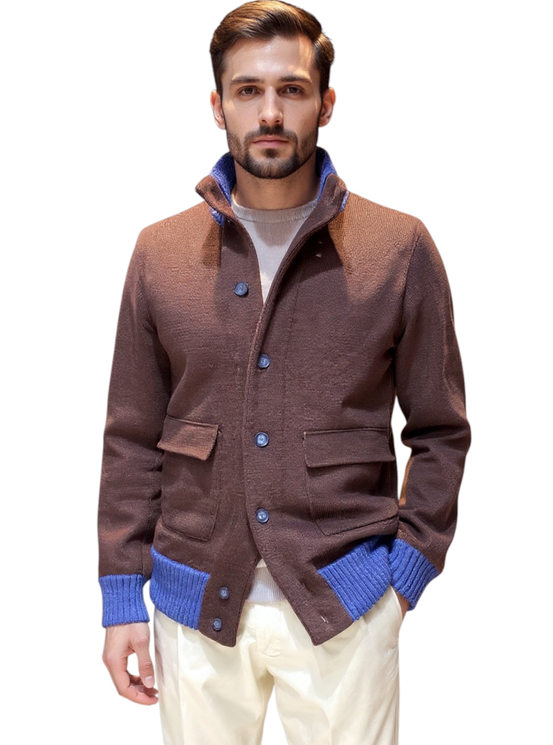 Novità di stile e ricercatezza della nuova collezione autunno inverno firmata Mark Midor. Blusotto uomo realizzato in lana 100% frutto della ricerca sartoriale autenticamente Made in Italy. Dettagli: chiusura frontale a bottoni, due tasche laterali con pattina, fondo, fondo manica e collo ad ampie coste coste a contrasto colore. Un grande classico del look italiano sempre alla moda e curato nei minimi dettagli grazie alla manifattura 100% made in Italy. Composizione: 100% lana merino. Il modello in indossa una taglia 50.