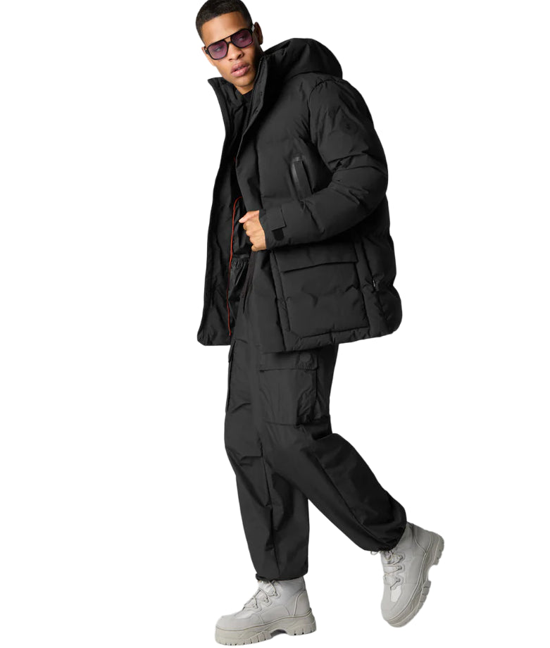 Il parka Quinlan, imbottito e con cappuccio,è ideale per affrontare il freddo. Caratterizzato da canali cuciti e termosaldati, si chiude con una zip a doppio cursore coperta da una patta con bottoni a pressione. Le tasche a filetto zippate presentano una stampa tono su tono e fodera in flanella, mentre le tasche basse si chiudono con patta e bottoni a pressione. La vita regolabile con coulisse, i cinturini a strappo sui polsi e i polsini interni in Lycra nera assicurano un comfort ottimale.