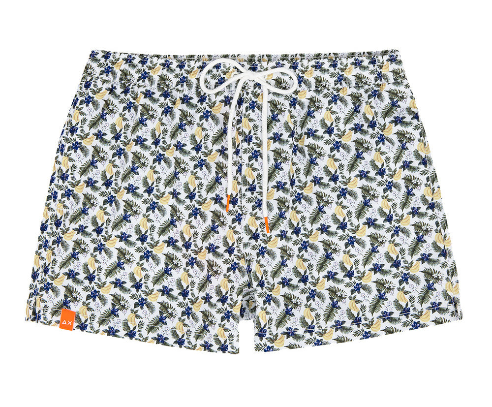 Un costume modello boxer della nuova collezione primavera estate 21 di Sun68, un capo essenziale per l'outfit balneare. Realizzato in morbido poliestere presenta un punto vita elasticizzato con coulisse e regolato da un laccio bianco, due tasche a filo laterali e il ricamo Fantasia Hawaii su fondo bianco. La vestibilità è regolare e il taglio è corto.