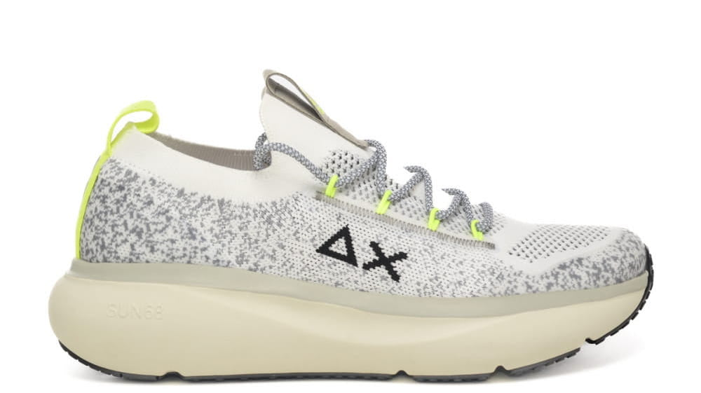 Sneakers da uomo Sun68 Jupiter Knit con chiusura con lacci in tessuto. Tomaia in tessuto con dettagli fluo. Logo ΔX effetto crochet ricamato sul lato esterno, maxi suola in gomma e logo lettering applicato sull'occhiello frontale.